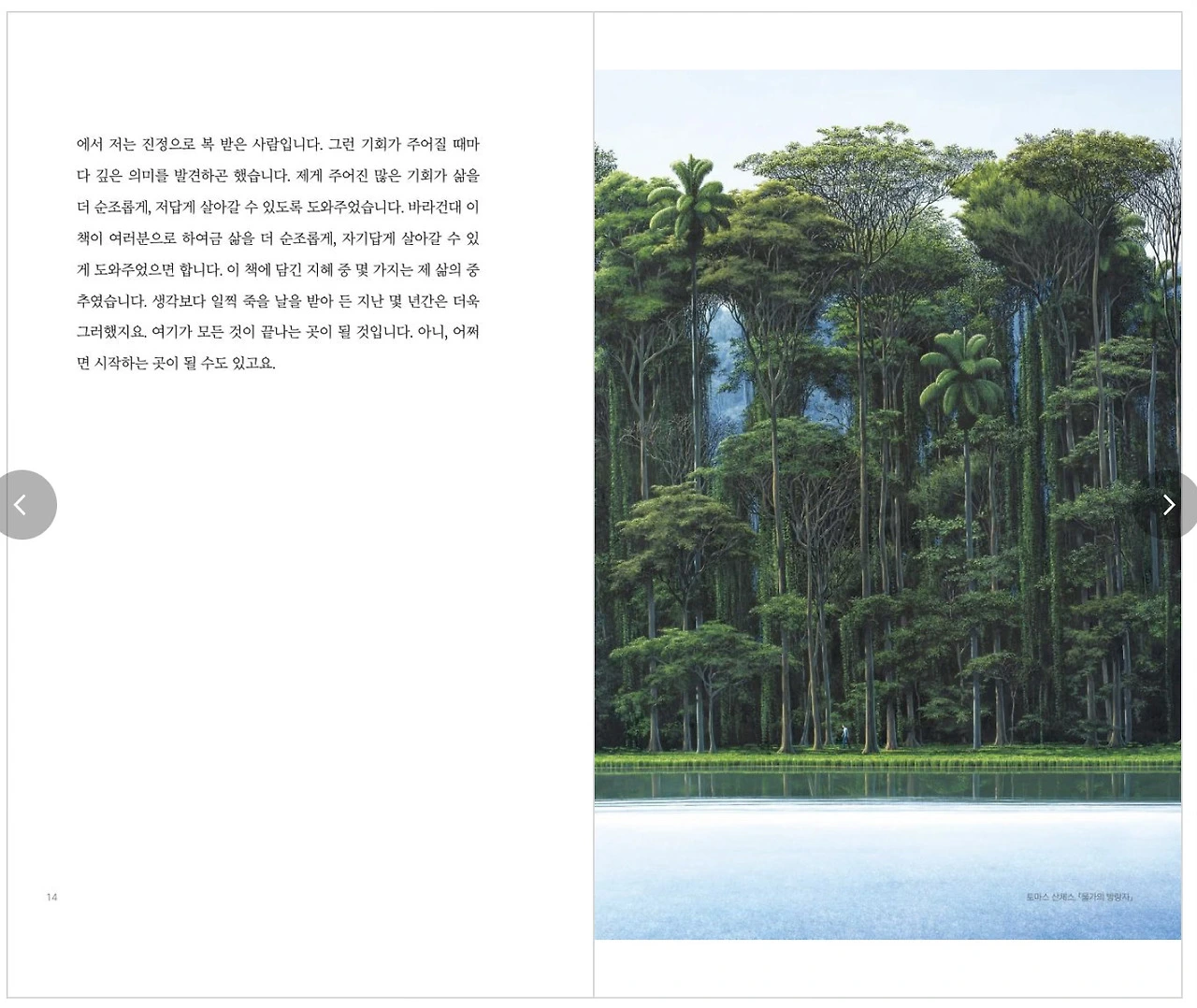 토마스 산체스(Tomas Sanchez). 십여 년간 명상을 수행해 온 그의 작품 속에는 자연과 인간의 조화가 담겨 있었다. 책 속에서 산체스의 그림은 저자의 메시지와 어우러져, 내 마음에 깊은 울림을 채워주었다.