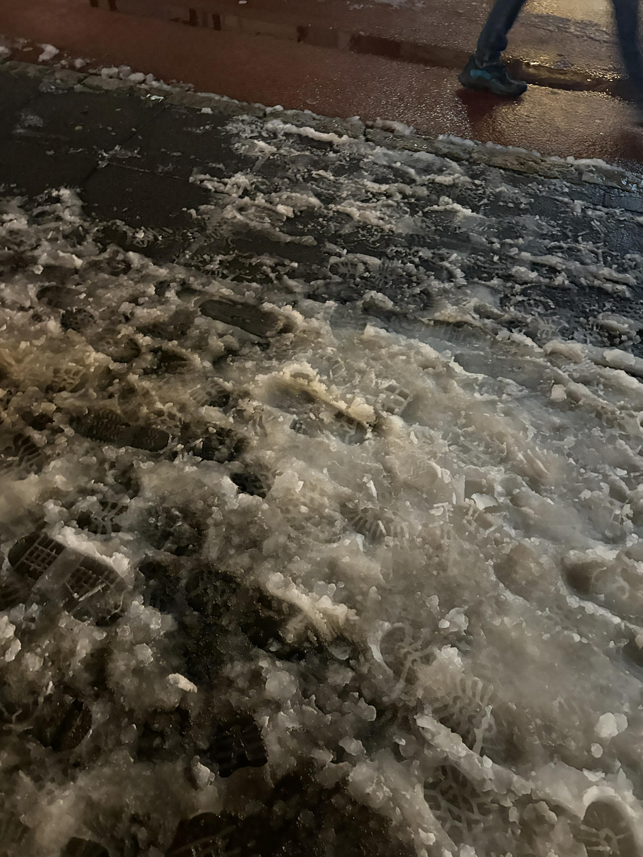 그리고 삼십 분째 계속 같은 곳을 돌고 있는 중이다. 눈먼지같이 날리던 것이 점점 굵어지고 많이 내리기 시작해서 가방에 눈이 쌓여가고, 길에는 어디서 흘러내려오는 물과 얼음과 그리고 지금 부는 차가운 바람과 함께 사방으로 내려치는 눈 때문에 걷기가 어렵고 난리도 아니었다. 길치다 보니 내 가방과 내 몸이 고생하는구나 하며 , 가방을 앞으로 돌려 매고 눈을 털어냈다.
