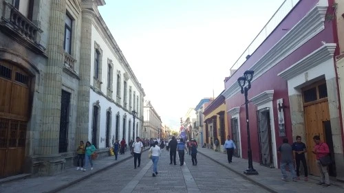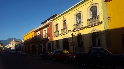 새벽엔 그렇게 춥더니 오후에 다시 나온 와하까의 태양은 말도 못 하게 뜨거웠다. 일부러 긴팔에 긴바지를 입고 나온 나는 금세 얼굴이 빨갛게 익어 버렸다. 와하까 시내 길거리는 아기자기 운치가 있다. 건물은 거의 모두가 2층으로 옛 양식을 그대로 보전하고 있다. 바둑판 식으로 이어진 길 덕분에 길과 길이 만나는 지점마다 같은 높이, 다른 색의 건물들이 아름다운 장면을 연출한다. 대도시의 풍경과는 사뭇 다르다. 알록달록한 건물과 푸른 하늘이 이 작은 도시를 한껏 돋보이게 해 준다.