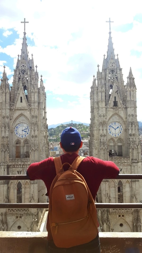 바실리카 대성당을 처음 봤을 때 파리의 노틀담 성당이 떠올랐었다. 두 건축물의 건축양식이 같은지는 모르겠지만 솟아있는 쌍둥이 탑이나 크고 둥근 모자이크 창문 등이 비슷하게 느껴졌다. 사실 성당 내부 자체는 그렇게 인상적이진 않았다. 중남미를 여행하며 수많은 성당과 교회에 들렀기 때문에 그저 잠시 기도를 하는 것으로 의미를 가졌다. 바실리카 대성당의 하이라이트는 뾰족탑 전망대다. 높디 높은 산과 붉은 지붕의 키토 시내 풍경이 성당의 쌍둥이 탑과 함께 한 눈에 들어오기 때문이다. 1층에서 계단을 따라 오르면 성당 지붕 위에 다다르고 거기서 다시 외부 철제계단을 따라 뾰족탑 꼭대기로 올라가게 된다. 그런데 이 철제계단이 너무나 가파르고 발을 디딜 수 있는 부분이 넓지 않아서 사람들의 작은 비명소리가 끊기지 않았다. '높이의 도시' 키토답게 가슴을 졸이며 계단을 오르면 드디어 아름다운 경치가 눈에 들어온다.