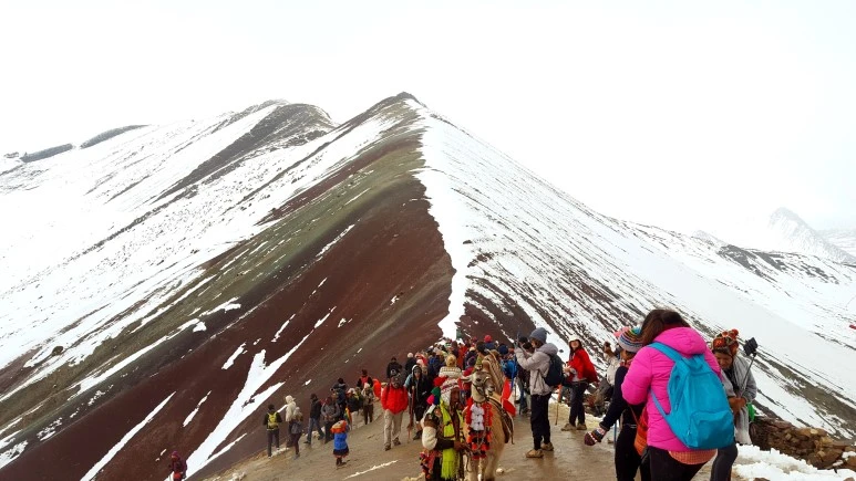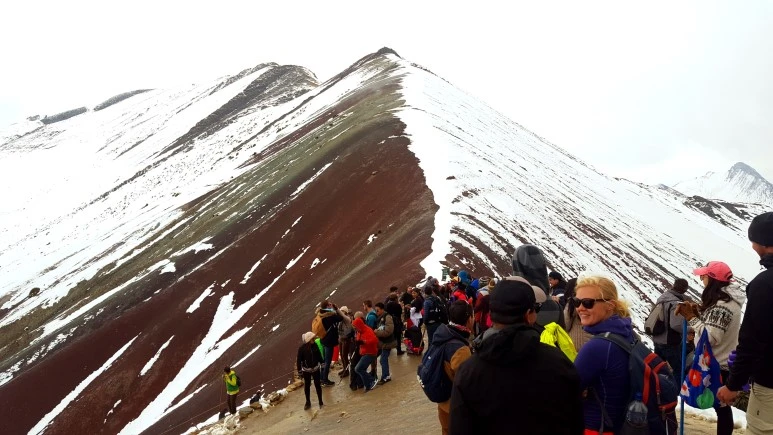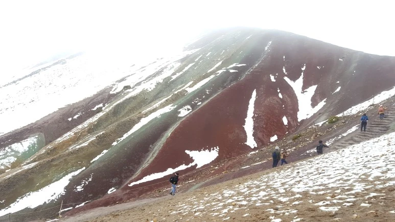 끝없는 설경, 정상이 가까워 올수록 조금씩 지치고 숨도 가빠왔다. 아무리 고산지대에 익숙해졌어도 해발 5,000미터는 역시 쉬운 것이 아니었고 나는 수시로 숨을 골라가며 드디어 정상에 올랐다. ‘아...’ 올라오며 예상한 대로 무지개 산의 한 쪽은 눈에 덮여 있었고 드러난 곳도 흐린 날씨 탓에 무지개 빛이 선명하지는 않았다. 사실 이 때는 너무 지쳐서 아쉬움보다 다 왔다는 안도감이 더 크긴 했지만 맑은 날 비니쿤카의 선명한 무지개 풍경을 생각하면 아쉽긴 하다.
