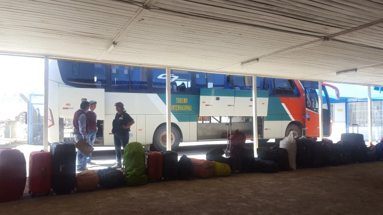 볼리비아 출국심사가 끝나면 버스를 타고 조금 이동하여 다시 칠레 입국심사를 받는다. 여기서는 다른 국경과 다르게 버스의 모든 짐을 다 빼서 일렬로 세워야 했다. 그리고 승객들이 간이 의자에 앉아 기다리면 국경사무소 직원이 개와 함께 나타나 짐을 검사한다. 몇 분 후 개가 아무 문제 없음을 확인해주면 직원 앞에서 직접 짐을 풀어 잠깐 동안 검사를 받는 것으로 끝이 난다.