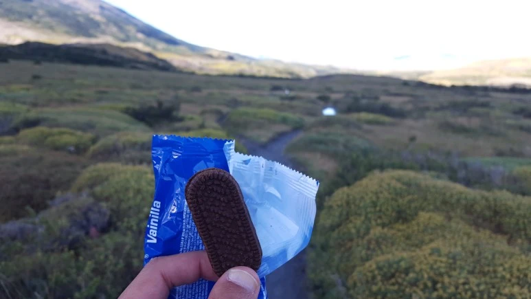 Camping Frances에서 Camping Central까지 가는 길은 최단거리로 16km, 가로로 길게 뻗은 호수 Lago Nordenskjold를 따라 동쪽으로 걸어야 한다. 호수가 끝나야 목적지가 가까워오는데 오늘 오후, 그 끝없는 호수는 지겨울 만큼 내 오른쪽에 있었다. 앞뒤로 멘 가방에 허리가 뻐근하고 등산화 딱딱한 신발 내부에 발 곳곳이 아프다. 지도 어플 '맵스미' 상의 내 위치는 왜 또 그리 더딘지, 고행과 같은 등산길이었다. 아마 오후 세시쯤 부터 더이상 경치가 눈에 들어오지 않았던 것 같다. 수시로 물을 마시고 '짝퉁 오레오' Frac을 먹으며 계속 걸음을 옮겼다. 내 걸음이 너무나 느려진 걸 느끼면서 계속 걸었고 등에 땀이 너무 많이 나서 가방에 든 물이 새나 싶은 순간도 있었다.