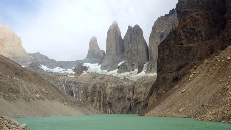 토레스 델 파이네의 '토레스'는 '타워'를 뜻한다. 즉 국립공원 이름 자체가 '파이네의 타워들'이고 오늘 오른 '3봉'이 바로 그 '토레스'다. 마지막 45분의 돌 길을 꾸역꾸역 올라가면 거짓말처럼 평평한 땅이 나오는데 거기에 옥색 호수가 있고 그 뒤로 '3봉'이 자리한다. 처음엔 뿌연 구름에 '3봉'의 머리 끝이 보이지 않았다. 나는 매서운 비바람에 얼마 입지도 않은 옷가지를 최대한 잡아 당기고 몸을 움츠렸다. '3봉'의 풍경보다 드디어 다 올랐다는, 그리고 얼른 바위 뒤에라도 들어 앉아서 바람을 피해야겠다는 생각 뿐이었다. 몸을 녹이며 가방에 넣어뒀던 초코 과자와 바나나를 꺼내 먹었다. 자갈 바닥에 쭈그리고 앉아 먹는 꼴이 흡사 거지 꼴 같겠다 싶었다.