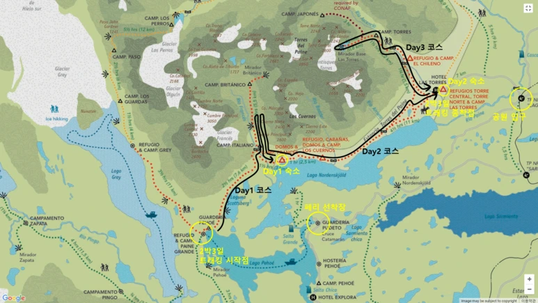 * 나는 W의 왼쪽 아래 꼭지점에서 시작해 W의 맨 왼쪽 직선 코스는 (Grey 빙하 방면) 건너 뛰고 나머지 W코스를 따라 동쪽으로 2박3일간 걸었다.