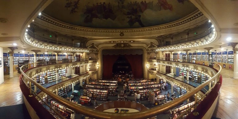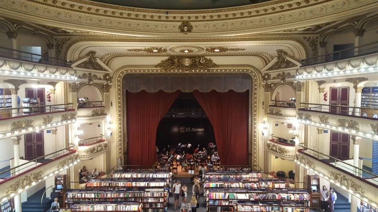 이번엔 이색적인 서점을 찾아갔다. 부에노스 아이레스의 명소 중 하나인 El Ateneo Grand Splendid 서점, 원래 극장이었던 건물을 개조해 만든 곳이다. 1919년 오픈한 Theatre Grand Splendid는 (Grand Splendid 극장) 이후 경영난으로 여러 명의 손에 넘어갔었다고 한다. 그 중엔 출판사이자 서점인 El Ateneo사도 있었는데 그 덕에 2000년에 서점으로 재탄생하게 됐다고 한다. 훨씬 클 줄 알았는데 서점은 생각보다 아담했다. 약 1,000명이 앉을 수 있었다는 객석은 이제 책장으로 채워져 있고 무대엔 음식과 차를 즐길 수 있는 테이블이 가득했다.