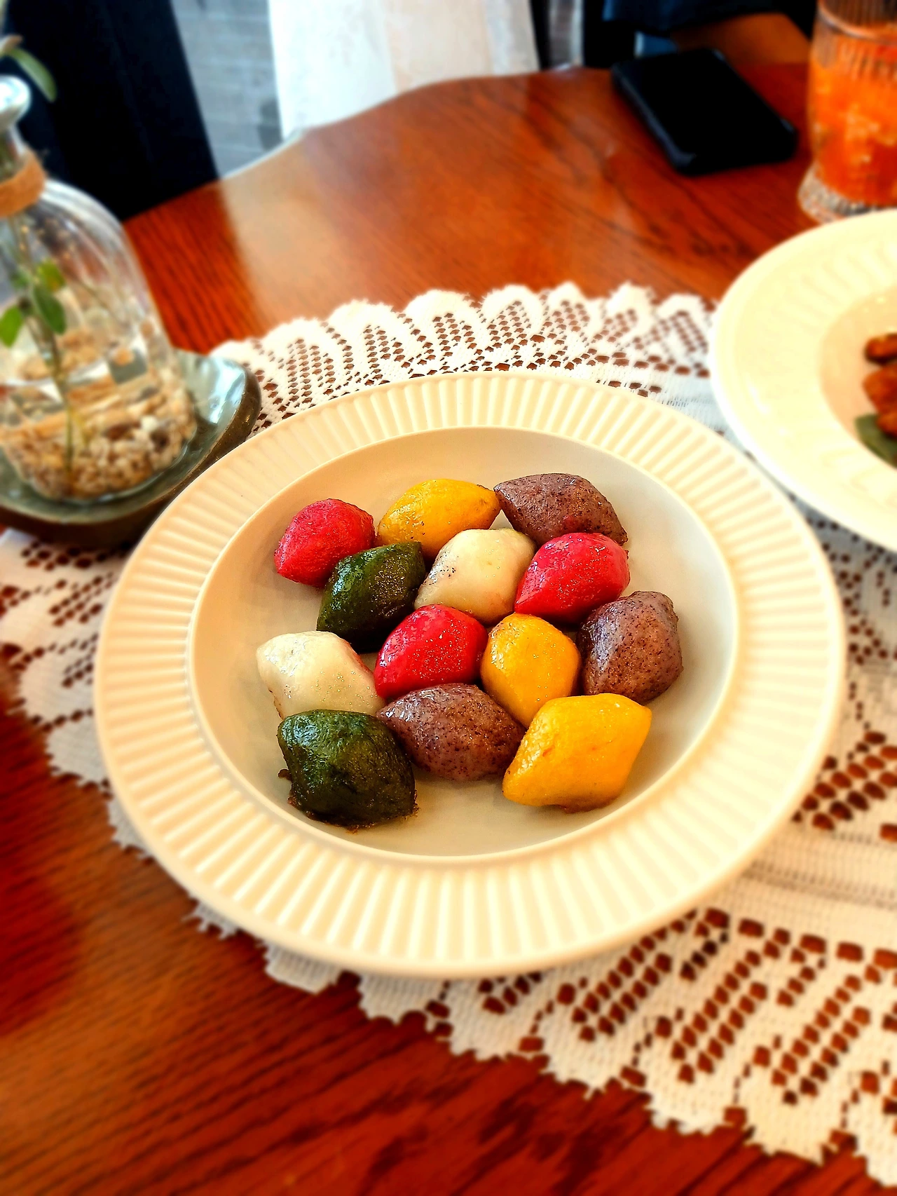 송편은 오색 송편을 준비 했어요. 밥솥에 찜보를 깔고 물 약간 참기름 두방울 떨어뜨리고 만능찜으로 20분 쪄 냈더니 너무 훌륭한 비쥬얼이에요.