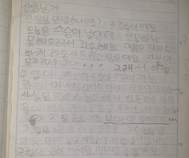 선생님 안녕하세요? 저 경훈이에요. 오늘은 스승의 날인데 선물 하나 못 해 드려서 죄송해요. 마음은 아파트 한 채라도 사 드리고 싶은데요. 자본이 모자라서 그만... 그래서 어쩔 수 없이 자본이 맞아떨어지는 카네이션을 샀어요. 달아드리지는 않았지만... 사실은 작은 수첩도 하나 샀는데 아이들이 계속 큰 선물들을 가져와서 전해 드리지 못했어요. 부끄러운 일이지만... 그 일을 반성하는 뜻으로 그 수첩을 일기장 밑에 붙일게요. 이제 할 말이 없네요. 그럼 안녕히 계세요. 이만 말 줄일 게요.