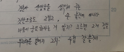 경훈아 선생님을 생각해 주는 것만으로도 고맙고, 큰 물건이 아니라 마음이 중요하다는 거 알지? 모르면 그게 정말 부끄러운 일이지 그치? 수첩 잘 쓸게.