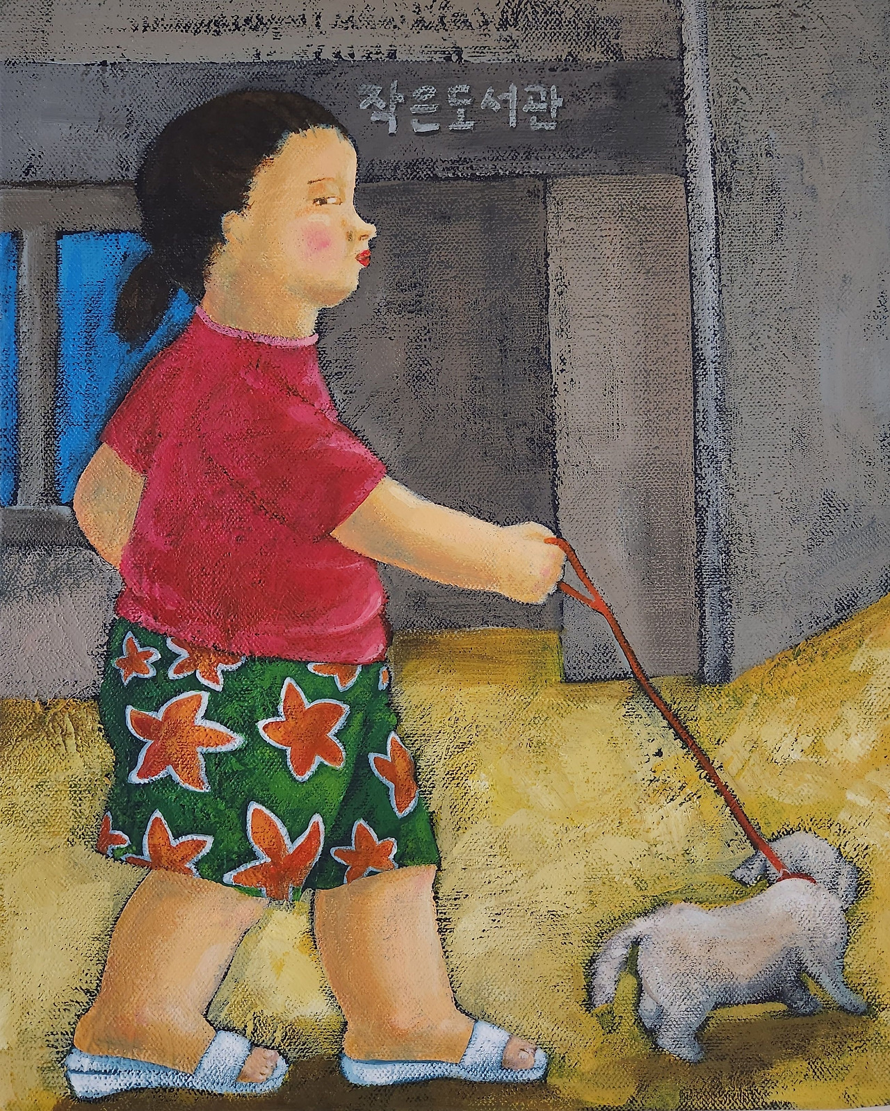 '이웃의 그녀는 강아지를 데리고 산책을 나왔나 보다. 그녀의 바지가 유난히 화려하고 돋보여 자꾸 눈길이 간다. 그녀도 내 눈길을 느꼈는지 겹눈질하며 나를 쳐다보았다. 가을이 온 날'