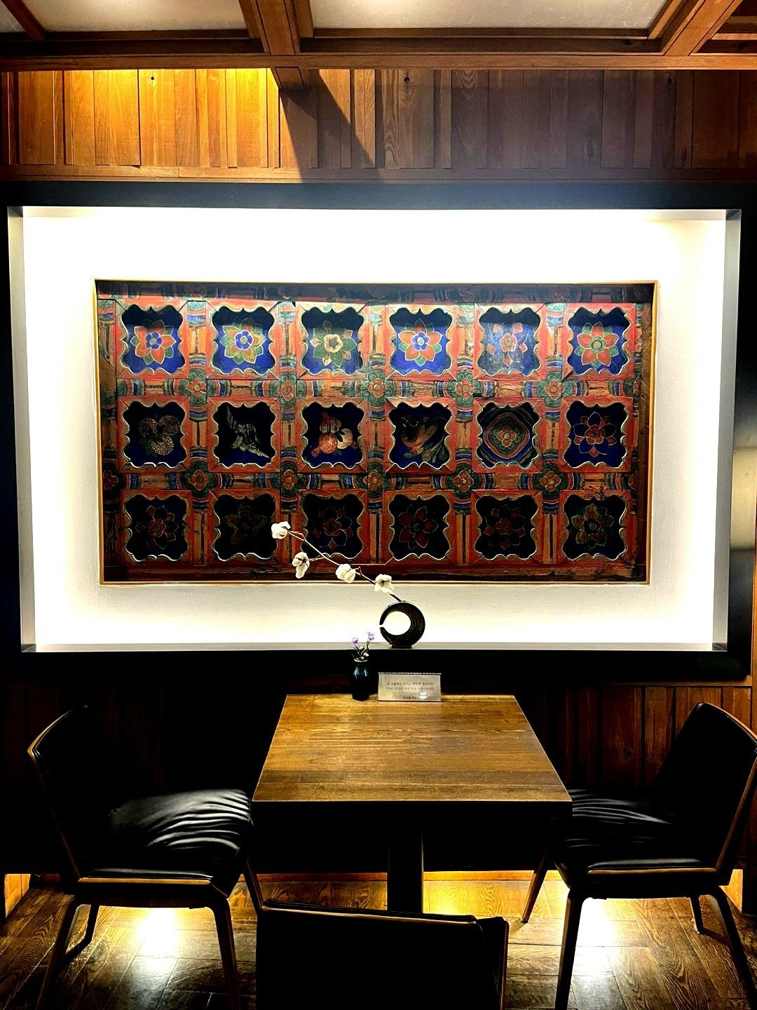 주문한 차를 기다리며 독특한 문양 패턴을 올려다보며 흰 여백과 연붉은 문양의 조화가 흥미롭다고 생각했다. 단층 문양이 주는 조화로움이 대담하고 멋스러웠다. 아주 한국적인 멋이 피어나고 있었다.