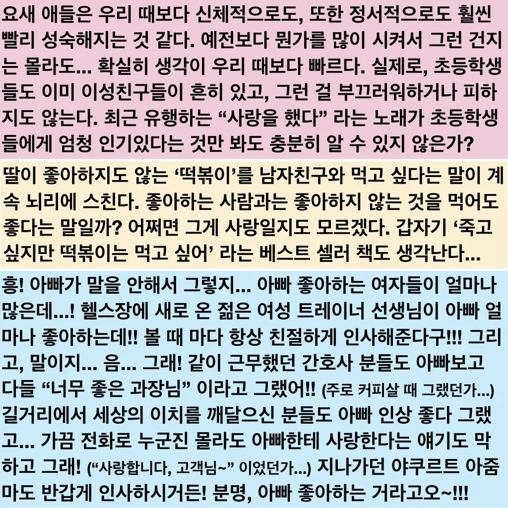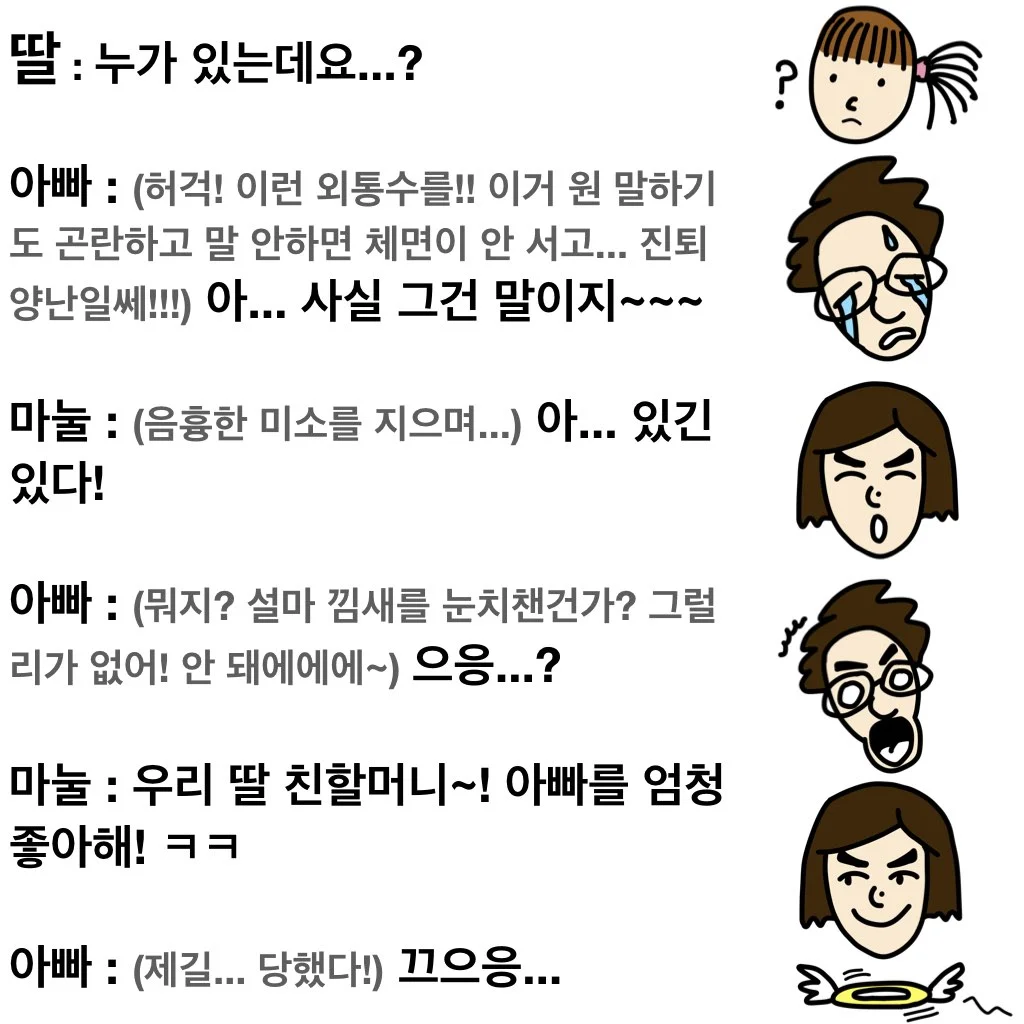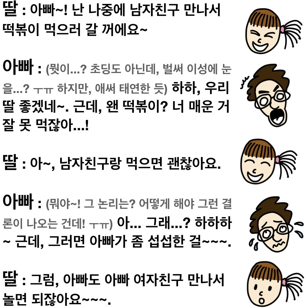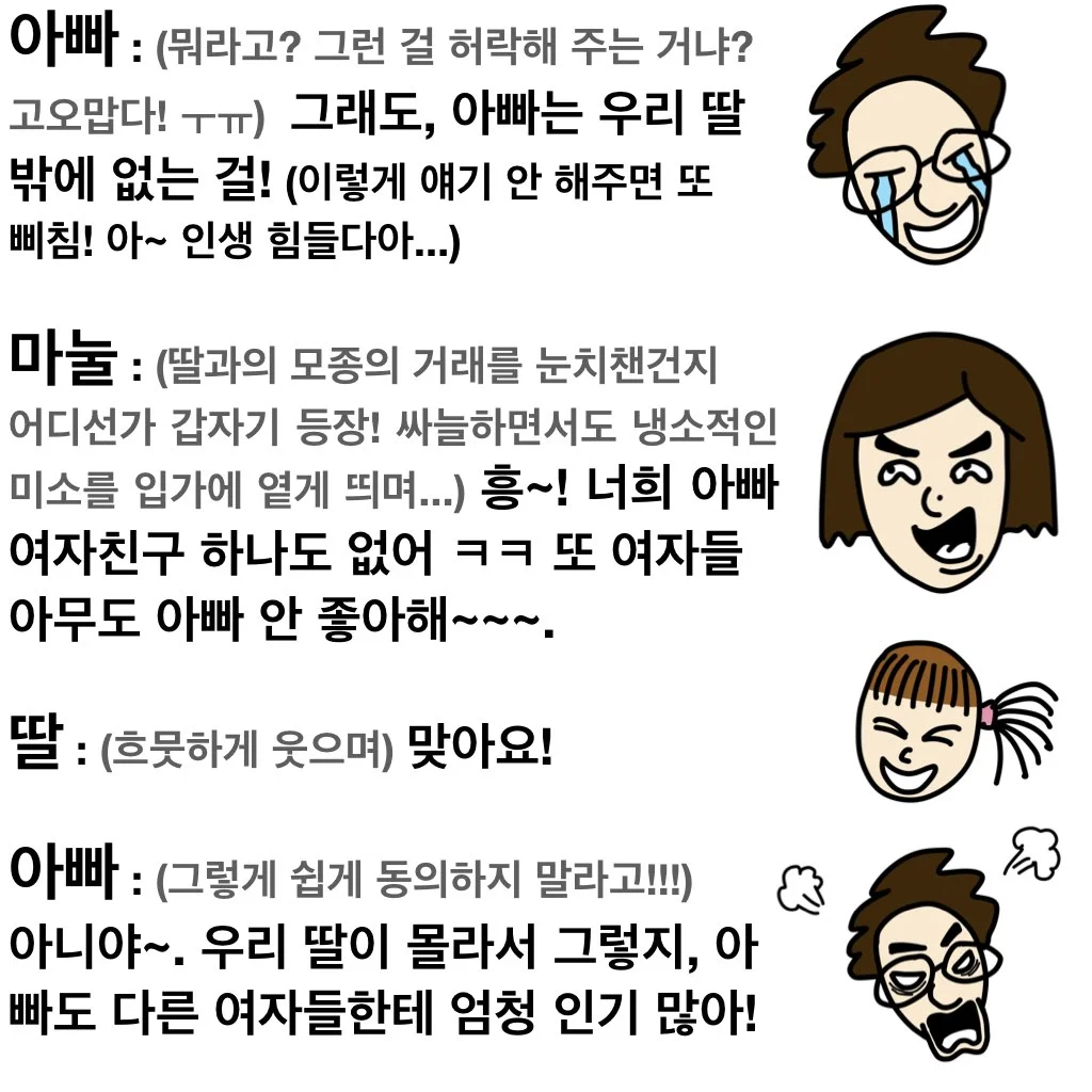 제가 딸바보인지는 모르겠지만 딸의 이야기들은 나름 웃겨서 귀를 기울여 보면 꽤나 재미가 있어요. 이 글이 어쩌면 딸랑 하나 그려놓고 끝날 수도 있지만... ㅋㅋ 그래도 딸과의 소소한 추억이 되지 않을까 생각하며~~~ 그냥 재밌게 봐주시면 좋겠네요!