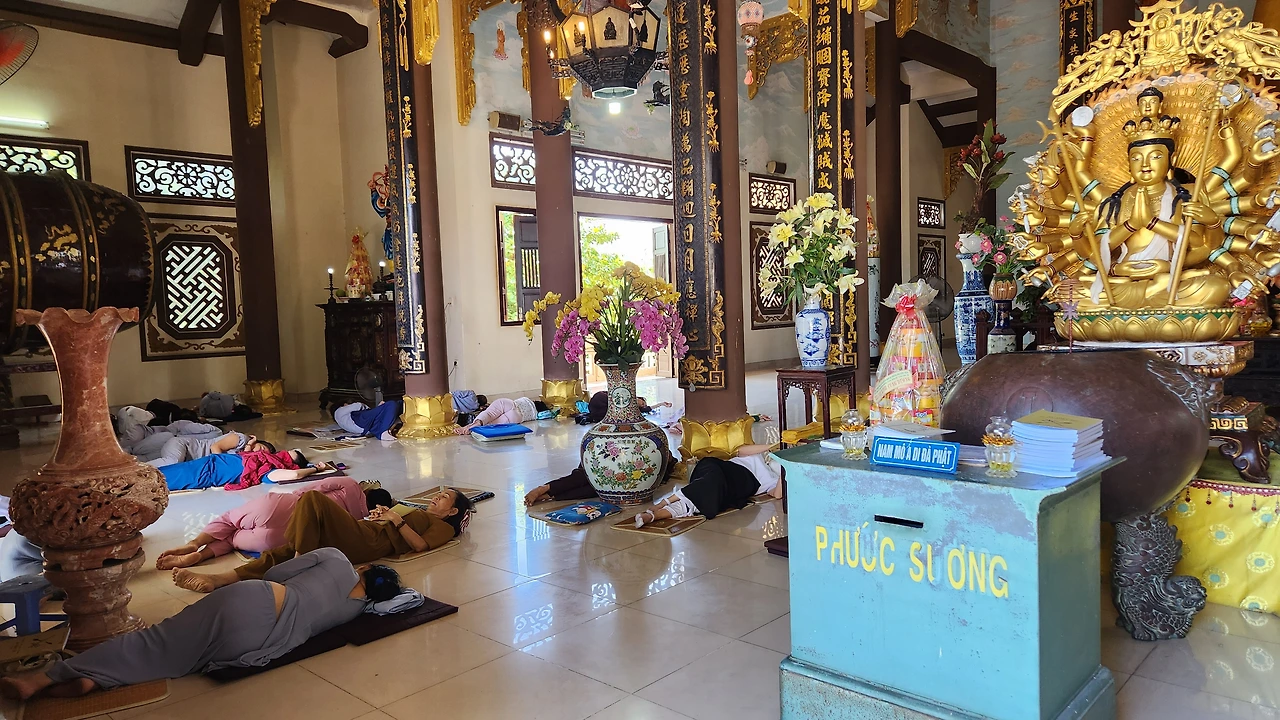 대웅전 안의 대불상을 둘러보고 시선을 돌리다가 살짝 놀라운 광경이 들어왔다. 낮이라 날씨도 덥긴 했지만 바닥에 많은 사람들이 누워 오수를 즐기고 있었기 때문이다.