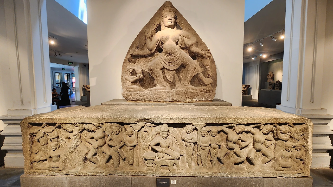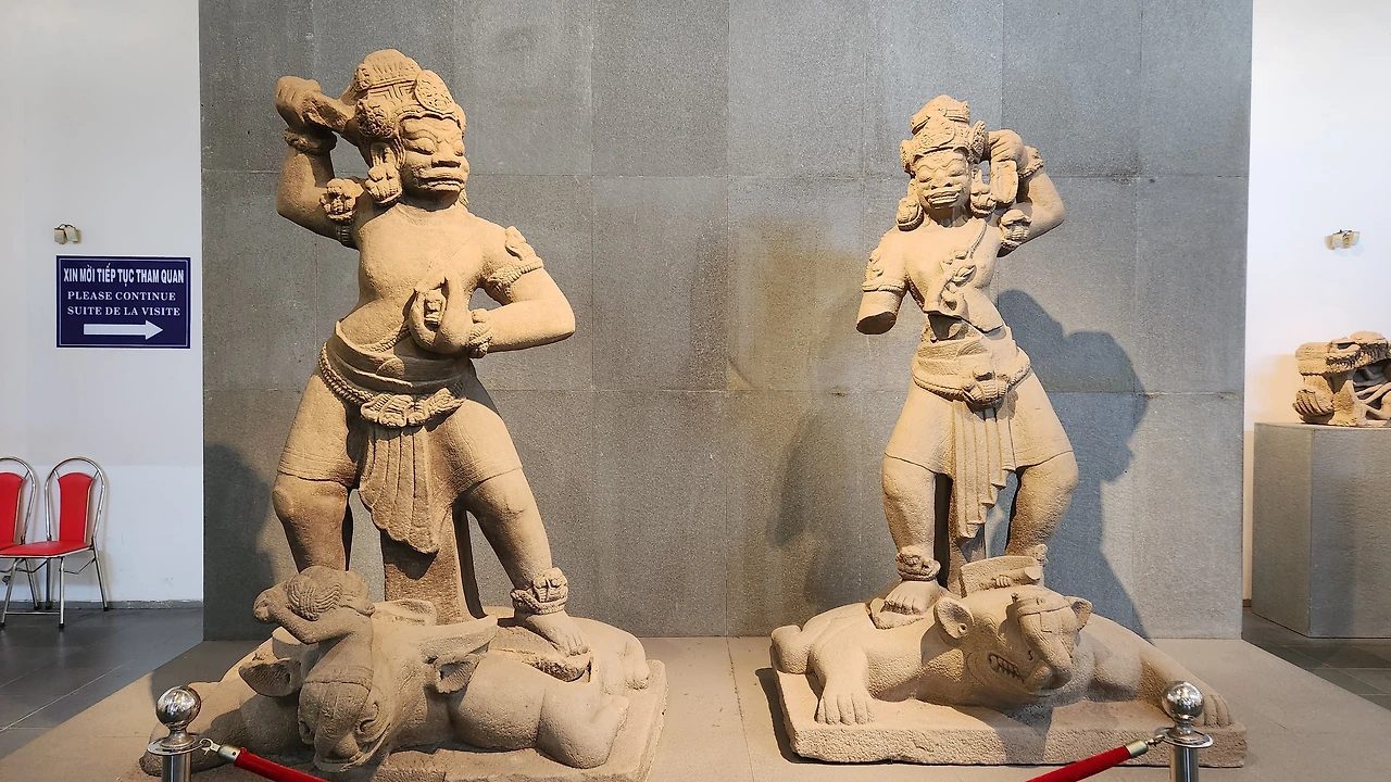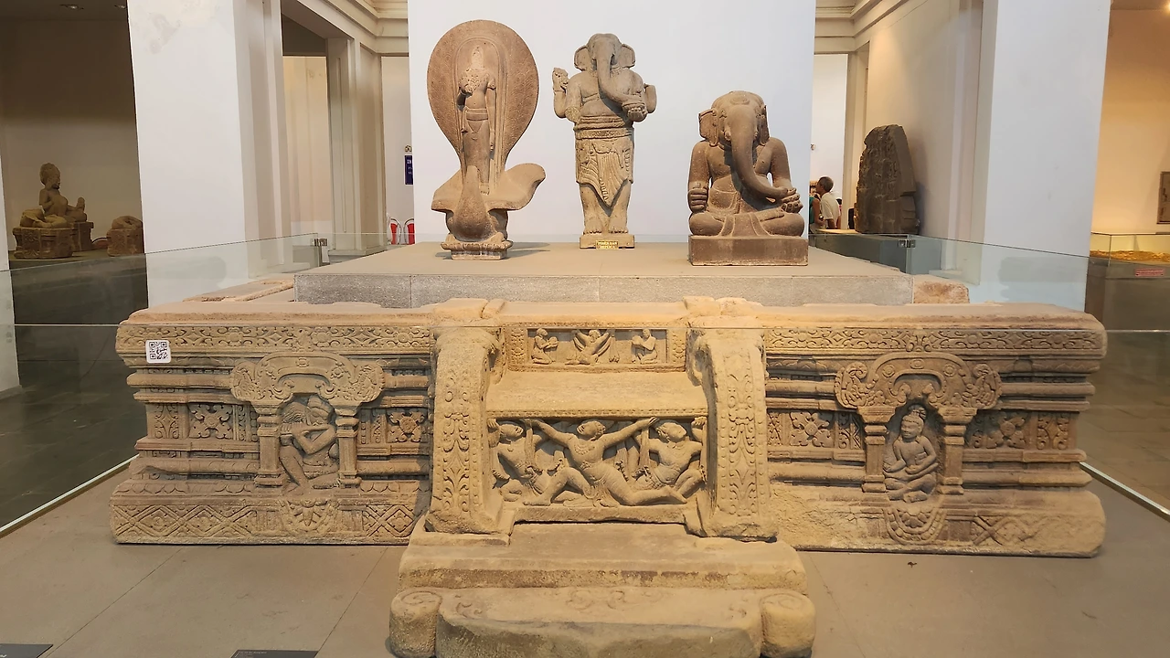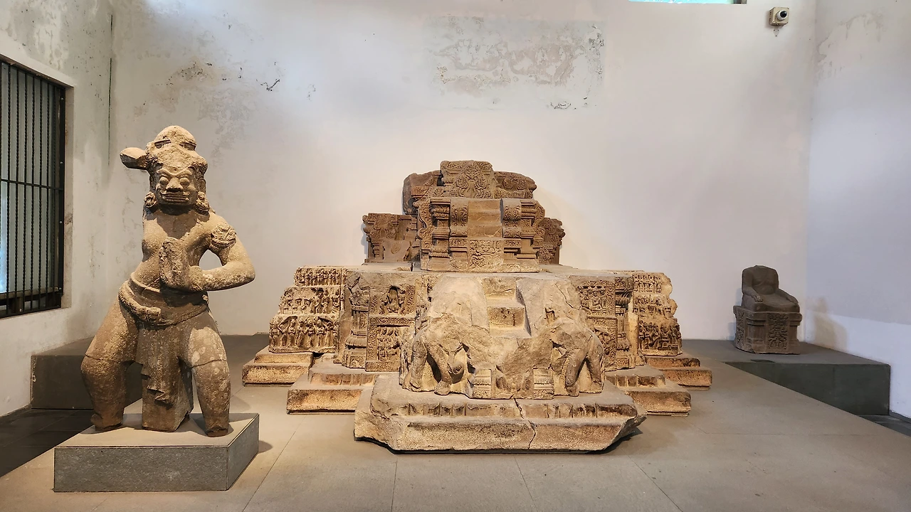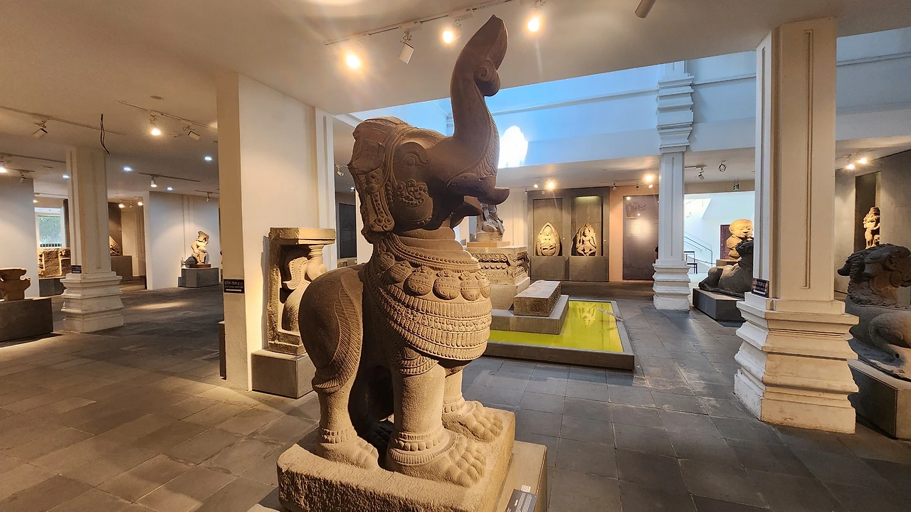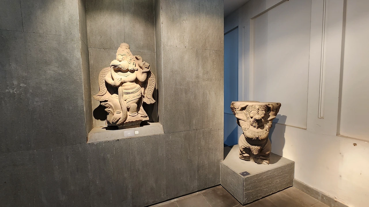 박물관은 주로 석조로 된 불교와 힌두교 조각상들로 이루어져 있다. 입구에 들어서자마자 거대한 석물이 관람객을 맞이한다.