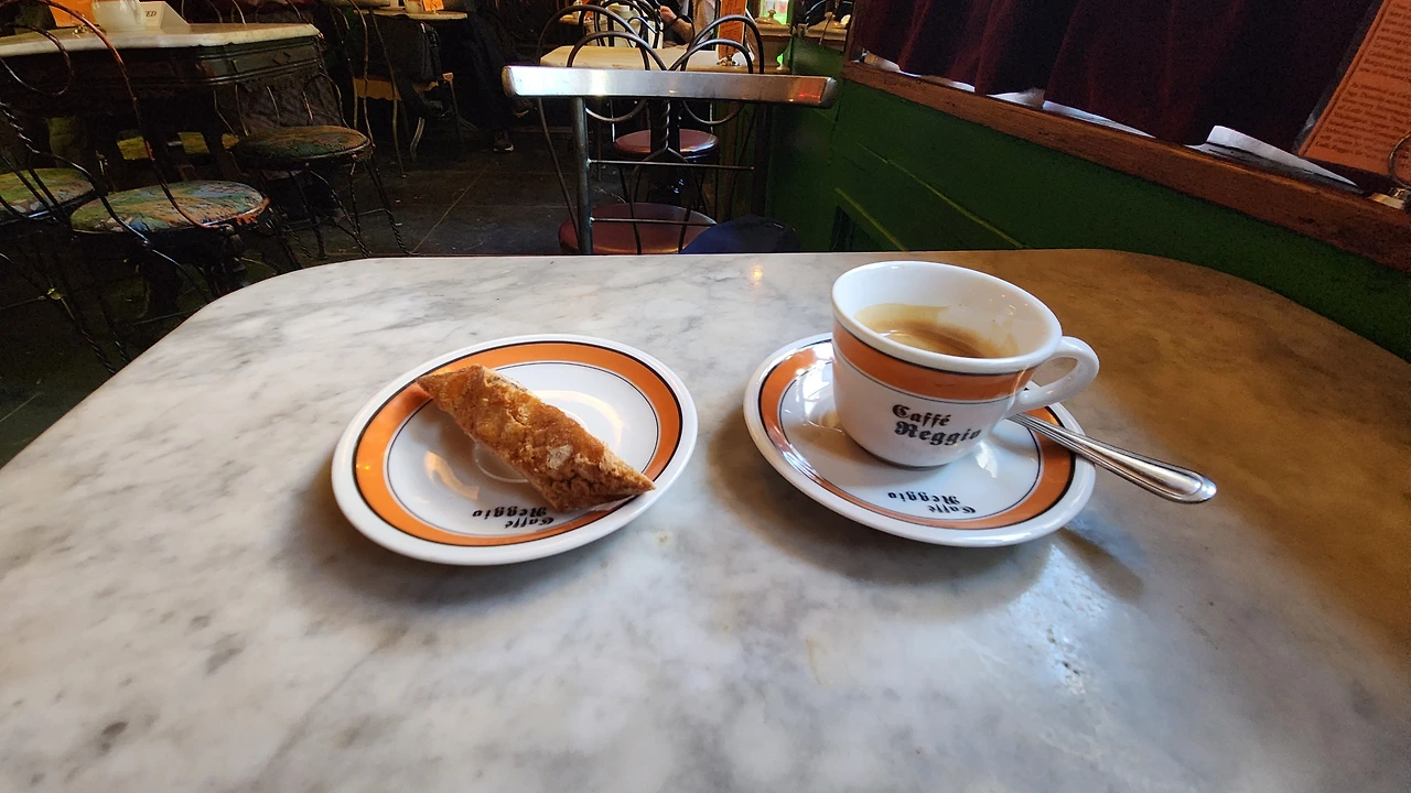 에스프레소가 먹고 싶어 조승연 유튜브에서 보았던 Caffe Reggio가 근처라 찾아가 보았다. 오래된 이탈리아 분위기의 카페였다. 비스킷토와 에스프레소 한 잔으로 잠시 휴식을 취하였다. 에스프레소 잔도 로마 스페인광장의 카페 그레꼬(Greco)를 닮았다. 두 카페의 연관이 있는 건 아닐까 생각도 해봤다.
