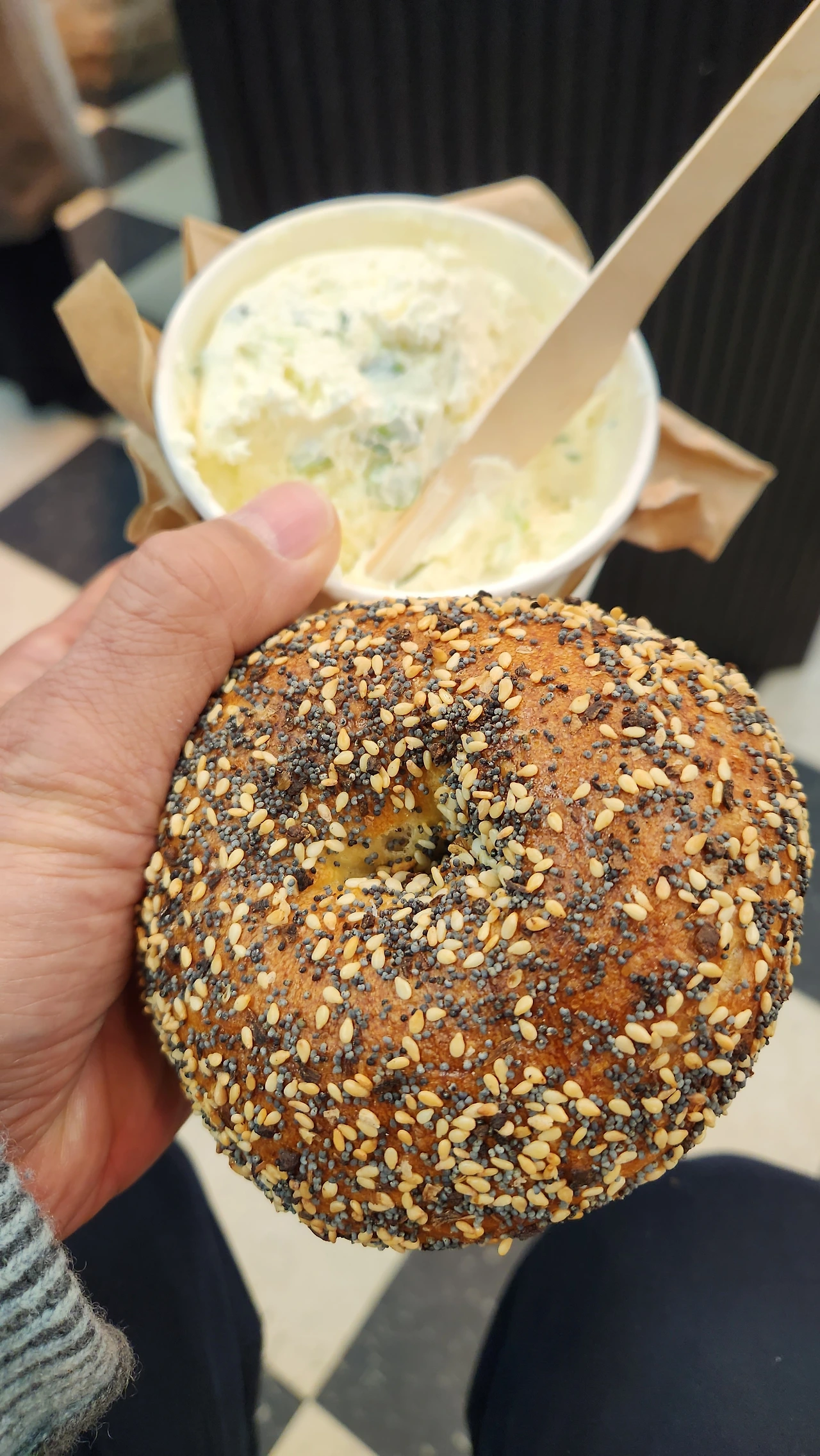 서울에서도 요즘 베이글이 유행이라 유명한 베이글집으로 걸어서 갔다. 아침이라 개랑 산책하는 사람 말고는 인적이 드물었다. 여기가 그곳인가 할 때쯤 가게 간판이 보인다. 평소에는 대기가 많다는데 오픈시간(7am)이 조금 지난지라 사람이 없다. 앞의 한국인 커플이 계산중이었다. 최소주문이 베이글 3개 + 크림치즈(Schmear) 1개이다. 베이글은 plain, everything, poppy로, 크림치즈는 scallion schmear로 주문했다. 베이글은 계산하자마자 종이봉투에 넣어서 바로 준다. 매장에 자리가 없어 대부분 근처 공원이나 길에 서서 먹는다고 한다. 아침이라 손님이 많지 않아 가게 안의 3개 있는 스툴에서 plain 하나를 뚝딱 먹어 봤다. 치즈가 맛있는지 괜찮다. 두 번째 everything은 근처 스타벅스로 가서 커피와 함께 맛을 음미하며 먹었다. 혼자서 다 먹기에는 양이 많다. 세 번째는 호텔에서 먹으려고 남겨 두었다. 나중에 호텔에서 전자렌인지에 살짝 데워 먹었는데 맛이 괜찮았다.