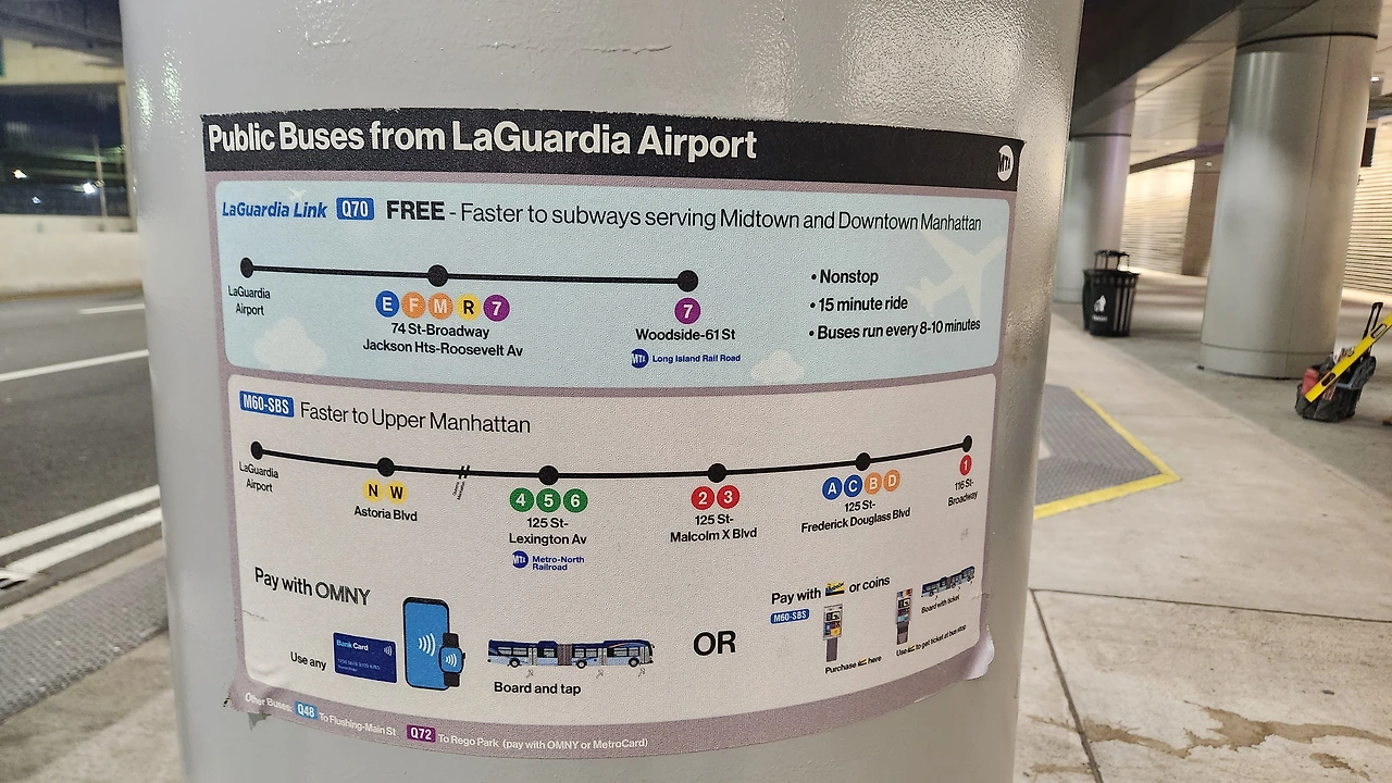 다리도 아프고 이제 슬슬 호텔로 돌아가야겠다. 근처의 지하철역을 검색하니 8 st.-NYU 역이 가장 가깝다. 뉴욕 지하철 탈 때 주의해야 될 건 출입구를 내려가 개찰구를 통과해 들어가면 한 방향으로만 탈 수 있는 곳이 많다. 방향을 잘 보고 내려가야 한다. 출발했던 역으로 가기 위해 이번에는 R노선을 이용해 Jackson Hts/Roosevelt Av. 역까지 돌아왔다. 플랫폼에 내리면 머리 위 안내판을 살펴보면 된다. Q70버스 탑승장 안내판을 따라 출구로 나가면 버스가 기다리고 있다. LGA의 터미널 C에 내려 무거운 가방을 들고 호텔까지 무사히 도착! 오늘의 여정을 마무리했다.