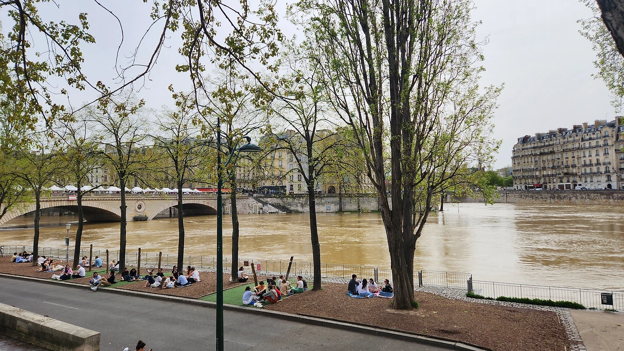 어제 상류에는 비가 내렸는지 센강은 강물이 불어나 강옆까지 물이 넘쳐흐르고 물도 흙탕물이다. 그래도 강옆 곳곳에 파리지안들이 일광욕을 즐기는 듯하다.