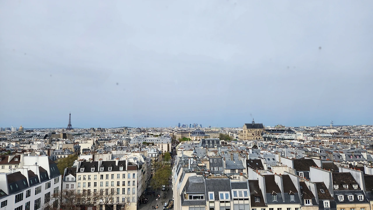 퐁피두가 파리 시내를 한눈에 볼 수 있는 뷰 맛집이다. 멀리 에펠탑(La Tour Eiffel)부터 오른쪽 시선을 돌리면 라데팡스(La Defense)와 몽마르트르(Montmartre)도 한눈에 들어온다. 왼편의 파리 시청(Hotel de Ville)을 따라가면 뒤편에 보수공사 중인 노트르담(Notre-Dame de Paris) 성당도 보인다. 센느(Seine) 강은 건물들에 가려 제대로 보이지는 않았다.