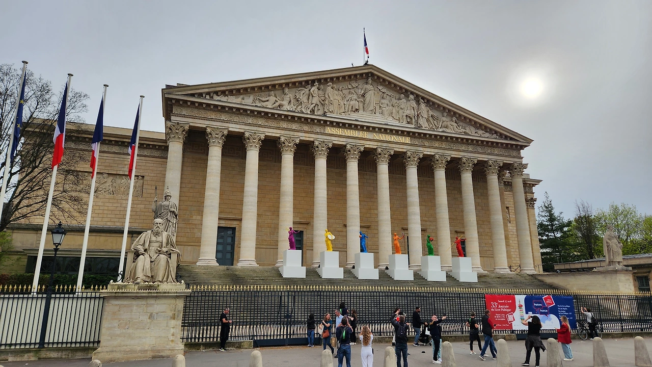 파리 오기 전 뉴스에서 본 하원의원 의사당(Assemblée Nationale - Palais Bourbon)에 설치된 2024년 파리올림픽 상징물을 보러 가기로 했다. 가는 길에 오르세 미술관(Musée d'Orsay)에서 잠시 쉬면서 다른 일행 두 명과 조우했다. 강 따라 조금 걸어가자 의사당 건물이 보이고 조형물들이 형형색색으로 신기하게 장식되어 있었다. 올림픽의 대표 종목들인데 그중 양궁은 한국을 대표하는 종목이란다. 그리고 양국만 한쪽 팔이 없는 것으로 되어 있는데 이것은 패럴림픽을 상징하기도 한단다.