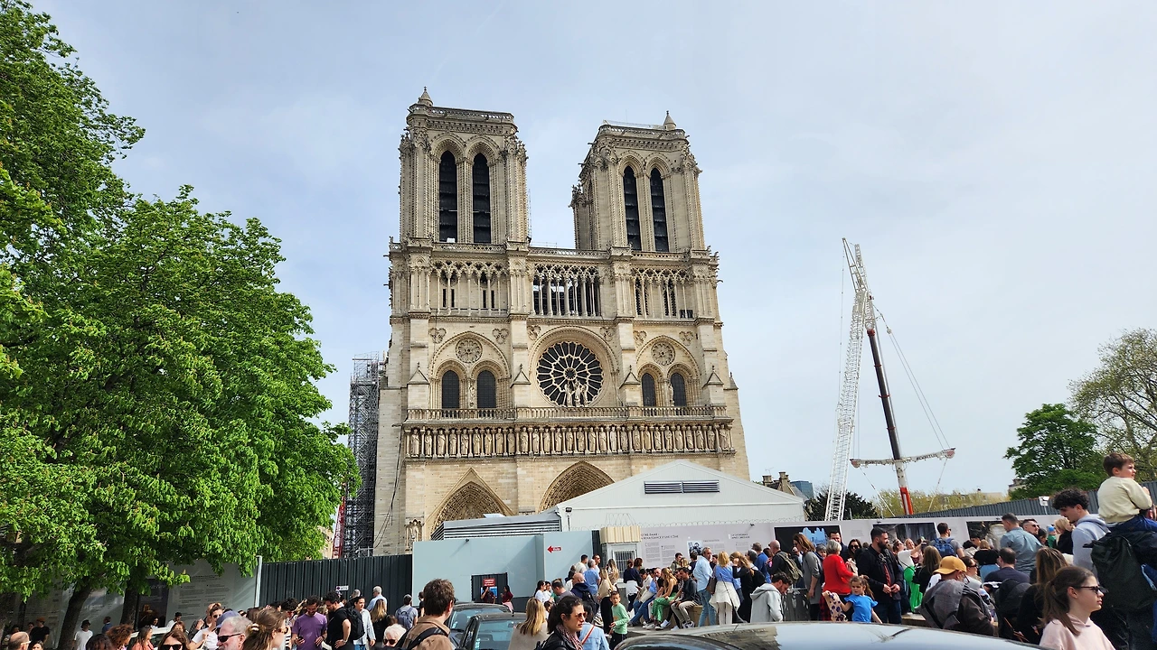 강을 건너 시테섬 안으로 들어오니 공사 중인 노트르담 성당(Notre-Dame de Paris)을 보기 위해 좁은 길 사이로 사람들이 꽉 들어차 있다. 성당 맞은편에는 스탠드를 설치해 공사 중인 성당의 파사드를 잘 볼 수 있게 했다.