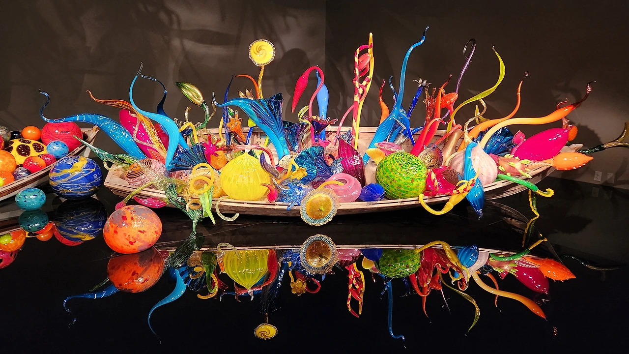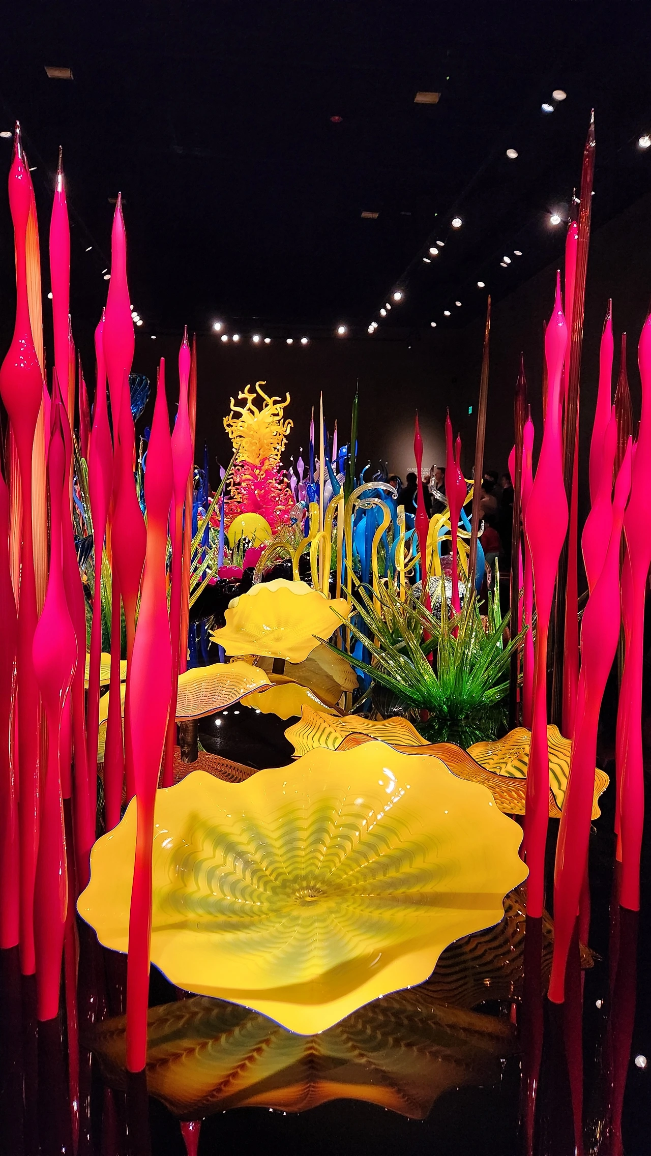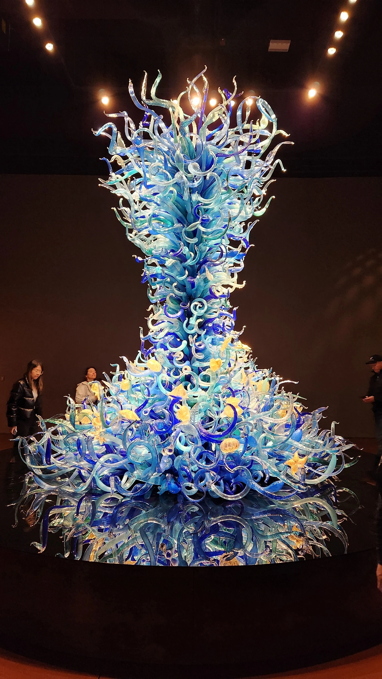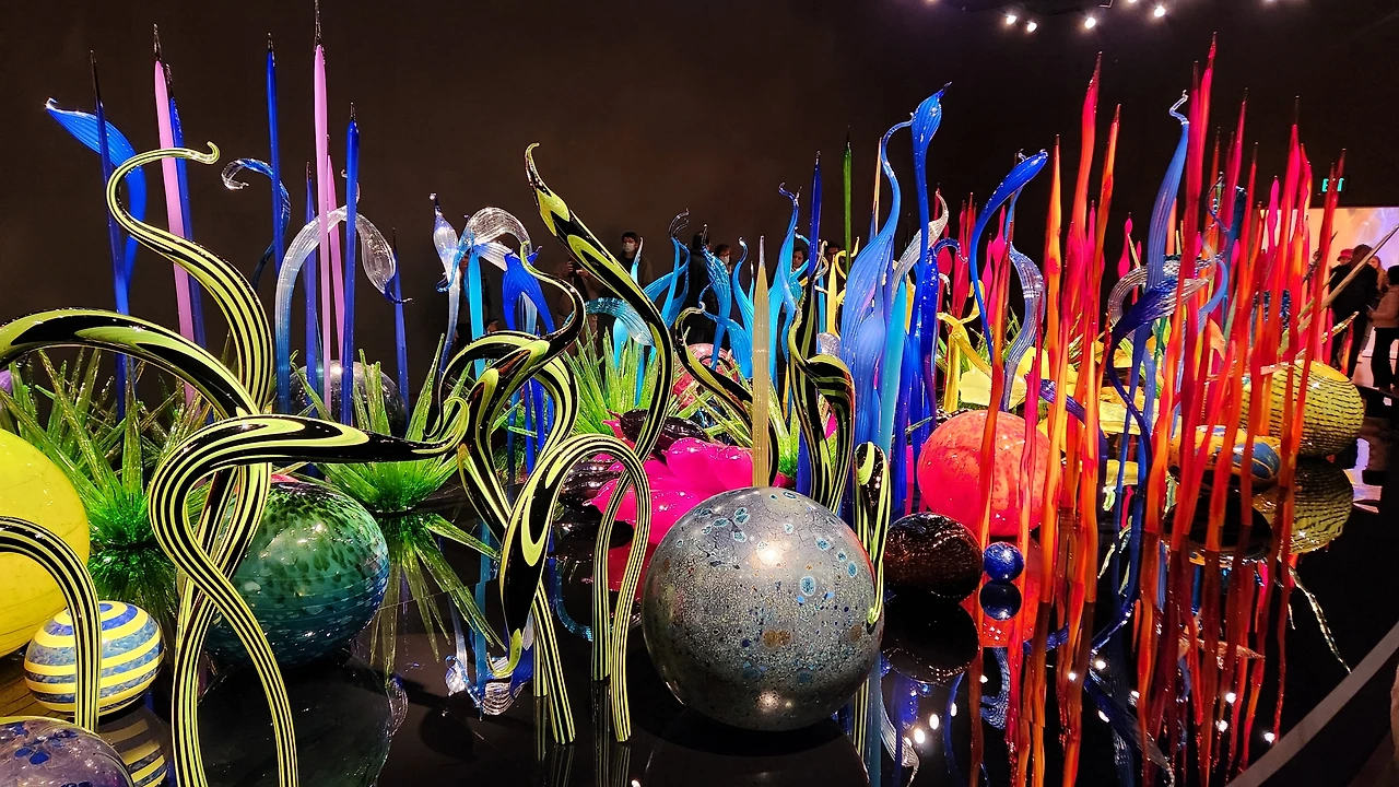 유리로 만든 꽃병 혹은 알록달록하게 만든 그릇들을 상상하고 갔지만 첫 전시실을 들어서자마자 그 상상은 여지없이 깨져버렸다. 유리로 이렇게도 만들 수 있을까라는 의구심이 들 정도로 작품의 크기도 압도적이었지만 정교함은 이루 말할 수 없을 정도였다. 화려한 색상으로 군락을 이뤄 만든 작품은 보는 방향에 따라 느낌을 달라 보인다. 유리는 球형으로 만들기가 쉽지만 늘리고 꼬으면서 여러 색상을 조화롭게 만드는 것이 다른 예술품이랑 사뭇 다르다.천장을 연잎과 같이 늘어드린(Bellagio Hotel의 그것과 비슷한) 유리들로 멋있게 장식해 놓은 것도 있다. 마치 거대한 샹들리에 같이 하나하나 꾸며서 만들어내 작품 앞에서는 감탄만 나온다. 전시장은 자연 빛이 들어오지 않아 조명으로 비추어 더욱 영롱하게 보이는 듯하다.
