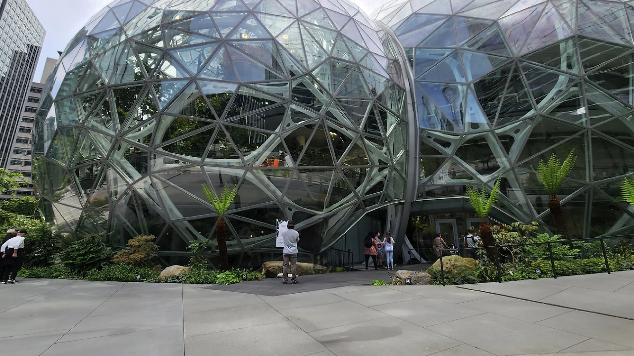 그다지 만족스럽지 않은 호텔 아침을 먹고 시애틀 중심가로 가기 위해 전철인 "LINK"의 ANGLE LAKE역으로 향했다. 비행근무 시 묵는 호텔에서는 SEATAC/AIRPORT역이 가까우나 이번은 한역전인 ANGLE LAKE역을 이용했다. 왕복 탑승권(1일 동안 구간 내 사용 가능하다)을 구매하고 가장 앞칸으로 자리를 잡았다. 시내까지는 40분 정도 소요가 된다. LINK는 지상구간으로 직선으로 시내까지 가지 않고 요리조리 시애틀 근교풍경을 볼 수 있어서 지루하지 않게 갈 수 있다. 시애틀 야구팀 마리너스 구장 T-mobile Parker를 왼편에서 지나면 시내로 진입이다. 우리가 내릴 역은 Westlake Center역인데 몇 정거장 전인 Pioneer Square역에서 대부분의 승객이 내리고있어서 우린 어떻게 해야 하나, 기다려 봐야 하나 하다 내려서 근처의 사람에게 물어보니 건너가서 타라 한다. 여기서부터 몇 구간이 공사 중이라 편도로 시간차를 두고 왕복 구간을 운행 중이다. 어렵게 Westlake Center에 내려 스타벅스 리저브로 향했다. 아침 시간의 시애틀 빌딩숲은 깨끗하고 고즈넉했다. 커피와 빵으로 간단히 채우고 Amazon 본사의 The Spheres를 밖에서만 보고 간다. 매월 2,4주 토요일에만 일반인에게 공개하는데 몇 년치 예약이 벌써 꽉 차 있어 앞으로도 들어 가 보기는 쉽지 않아 보인다.