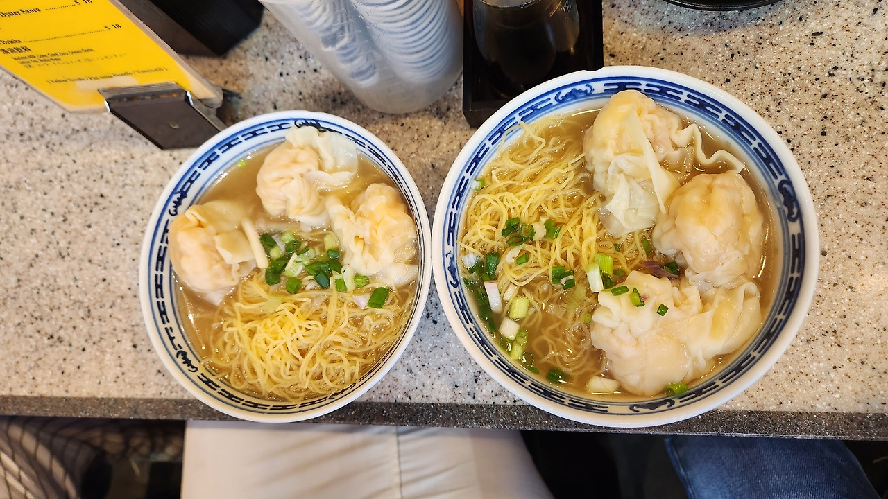 배가 좀 꺼진 듯하여 Tsim Kai Kee로 향했다. 멀리서 보니 대기가 한 명도 없다. '쉬는 시간이면 어쩌지?' 하는 마음에 얼른 가게 안으로 들어가니 사람이 많이 앉아 있어 다행이다. 우리 일행을 옆으로 네 명 나란히 앉은 좌석으로 안내하여 앞의 모르는 사람과 마주 보고 앉았다. 홍콩 식당들은 빈자리에 사람을 붙여서 앉힌다. 이곳에서도 역시 시그니처 기본 완탕면 주문했다. '그럼 그렇지!' 자리에 앉아 음식 기다리며 창밖을 보니 다시 대기 줄이 늘어났다. 우리가 운 좋게 사람 없는 타이밍에 들어온 것이다.