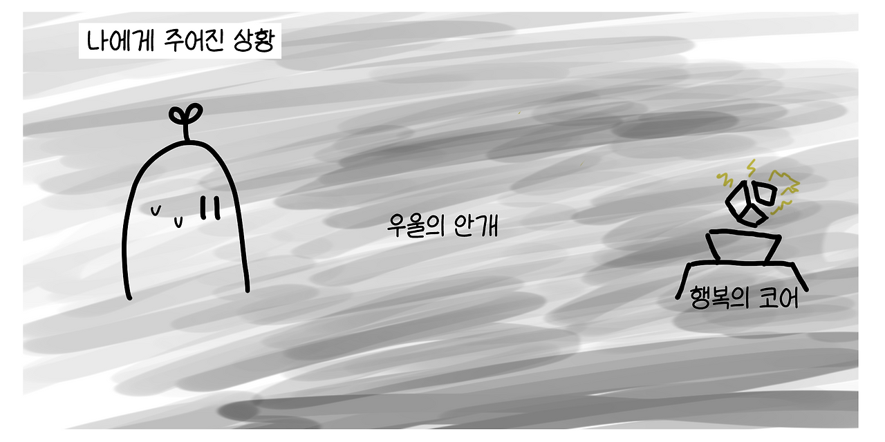 부정적인 감정은 부정적인 상황을 가렸습니다. 말하자면 현실의 문제 몇 가지가 제 행복의 코어를 파괴했는데, 그 자리에서 우울이라는 독성 안개가 잔뜩 뿜어져나오고 있었어요. 핵심적인 문제가 다른 문제를 만들어서 저를 괴롭게 하니, 저는 핵심적인 문제를 해결하는 데에 집중할 수가 없었습니다. 문제가 해결되지 않으니, 저는 계속 우울과 불행 속에서 괴로워하게 되었어요.