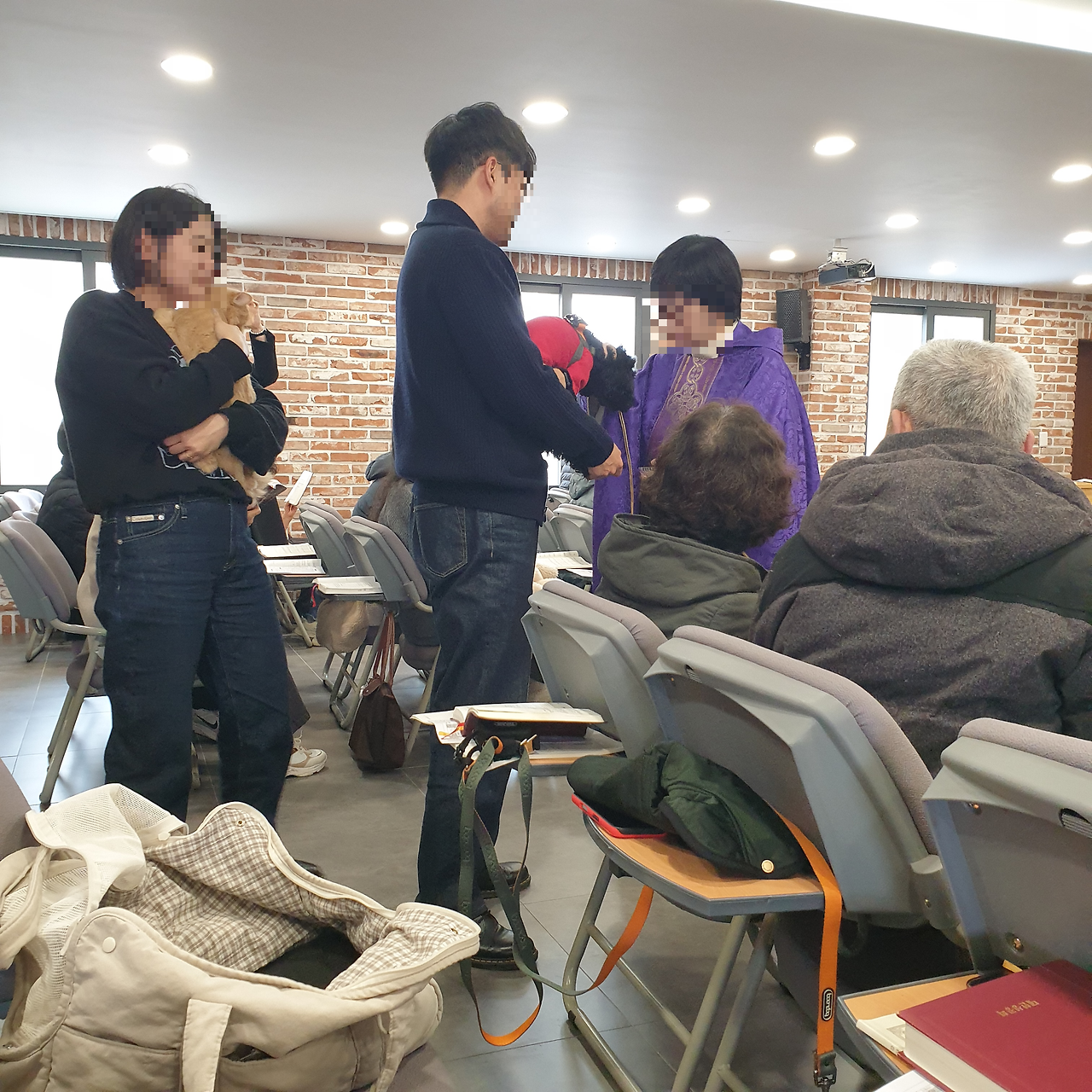 미사 후에 당근이 엄마가 이동장을 열고 당근이를 인사시켜 주었다.