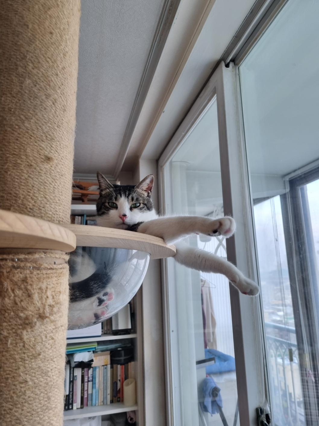 차르 발바닥과 똥꼬 얼룩이 잔뜩 묻은 아크릴 해먹에 동그랗게 몸을 구겨 넣고 두 팔은 밖으로 뻗은 채 창밖을 내다본다.