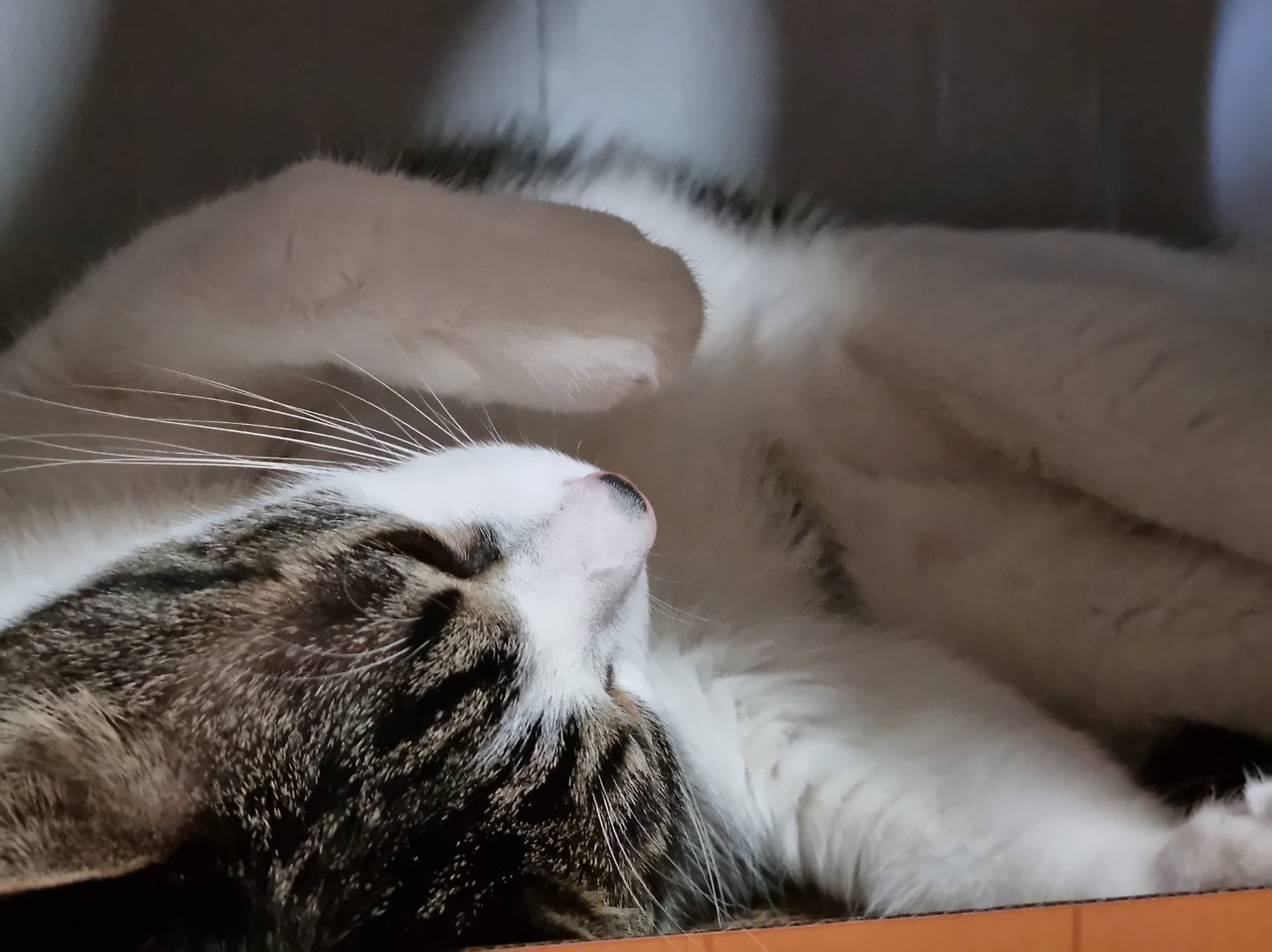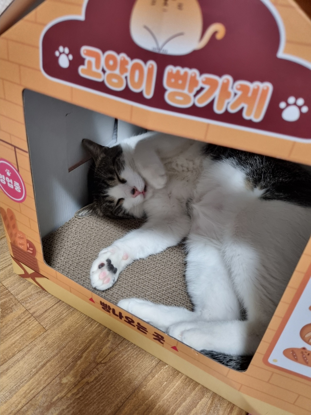 대자로 뻗고 자는 것을 좋아하는 차르는 얼마 있다 다시 나와 이번에는 널따란 애착박스로 옮겨 쭉 뻗고 잔다.