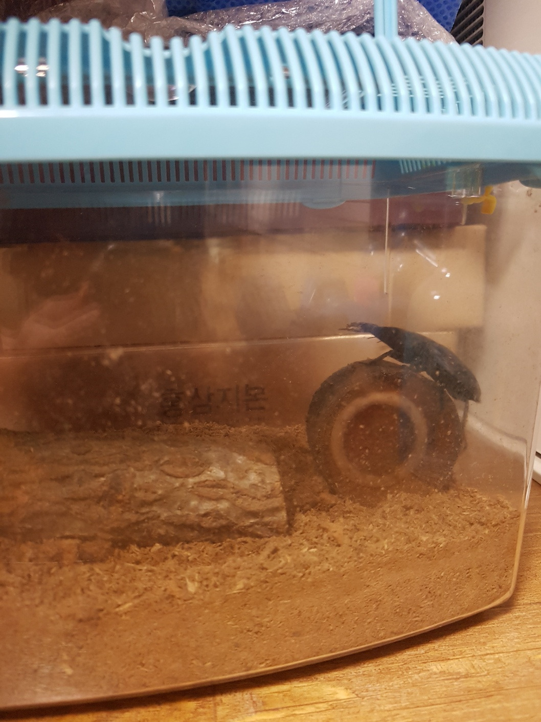 어느 날 밤, 플라스틱 집 벽을 치는 딱딱 소리가 유난히 컸다. 그런 일이 처음은 아니라 바로 들여다보지 않았다. 다음날 아침 일어나자마자 보니 녀석이 발랑 뒤집어져서 심하게 버둥대고 있었다. 얼마나 버둥댔는지 다리도 몇개 떨어져 있었다. 그리고 곧 움직임이 멎었다.