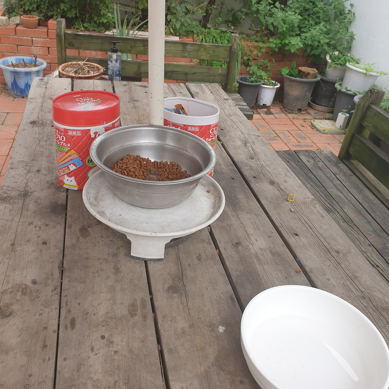 교회 마당에 있는 나무 탁자 위에 항상 사료와 물, 간식을 준비해 놓으신다.