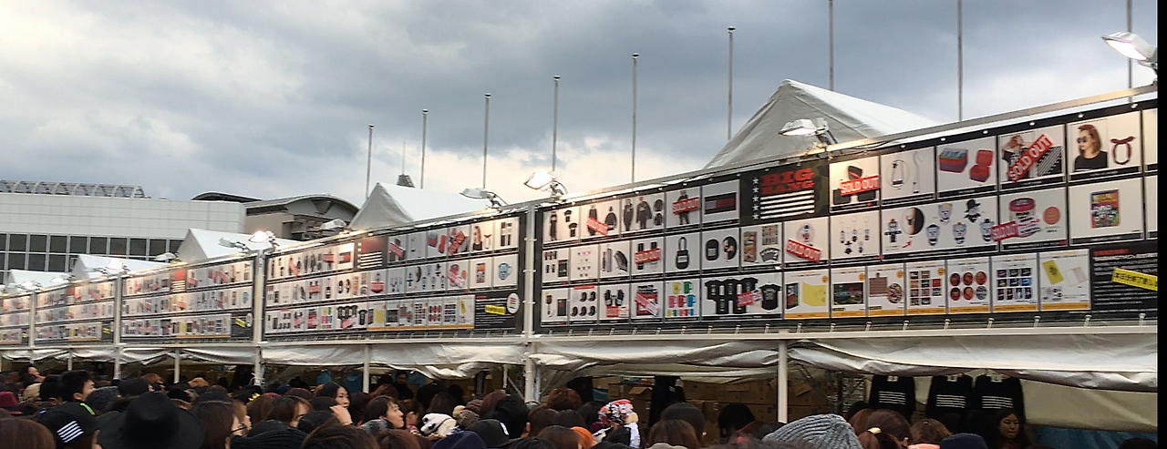 아래 사진은 가족과 함께 후쿠오카 ‘야후돔’에서 개최된 빅뱅 콘서트에 참가하여 직접 촬영한 사진이다. 팬으로서 굿즈를 사기 위해 두리번거리다가 사람들이 길게 줄 서있는 것을 발견했다. ‘무슨 줄이지?’ 앞쪽으로 따라가 보니 ‘헉, 굿즈 구입하는 줄’. (하단 '설문 조사 결과' 참조 : 참가자 구입률 37.3%)