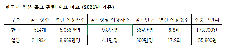 · 골프장당 이용자 수 : 한국이 일본의 약 2.4배. 한국에서는 수요에 비해 공급이 부족하다는 것을 알 수 있다. 일본은 그 반대의 현상이 나타난다. 따라서 ‘주중 그린피’도 한국이 일본의 약 3.1배 비싸다.