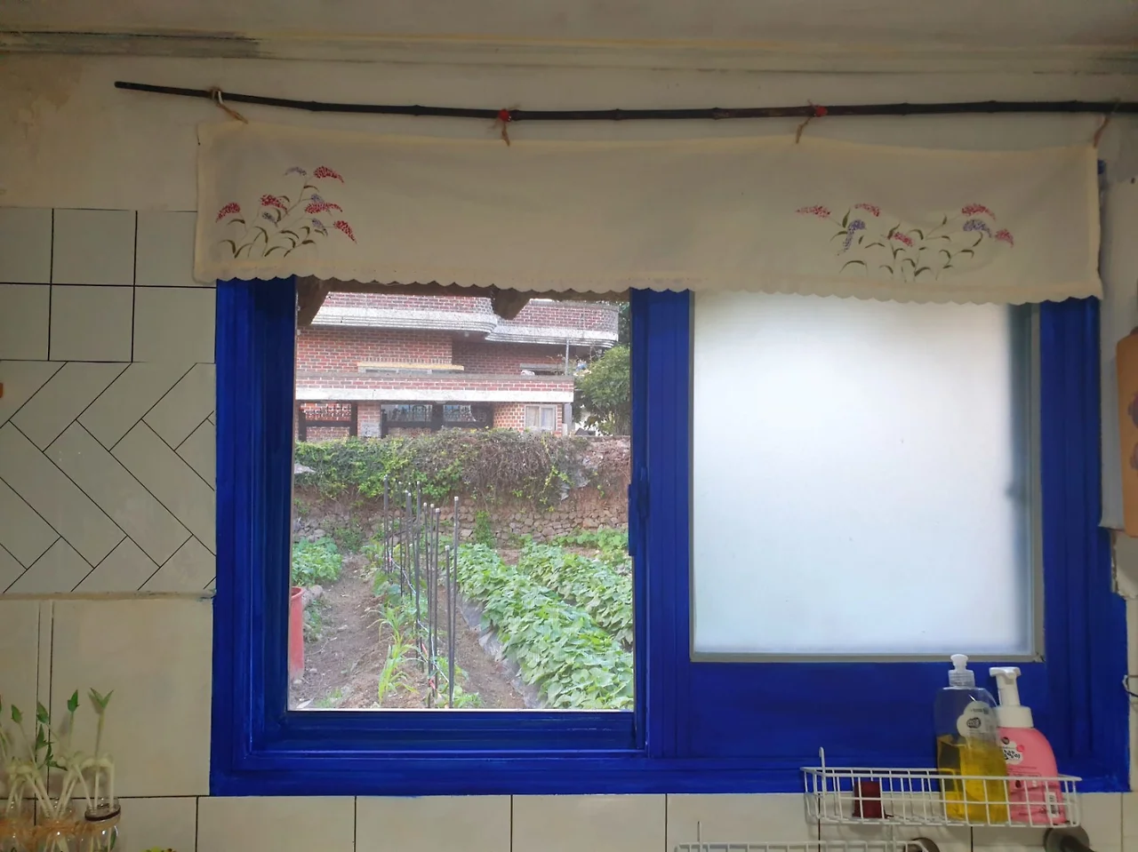 리폼한 화이트 싱크대와 어우러지니 나름 괜찮다. 광목에 귀여운 레이스 재봉틀로 드르륵 박아 잔잔한 여뀌꽃 그려 오죽을 잘라 걸어 주었다.