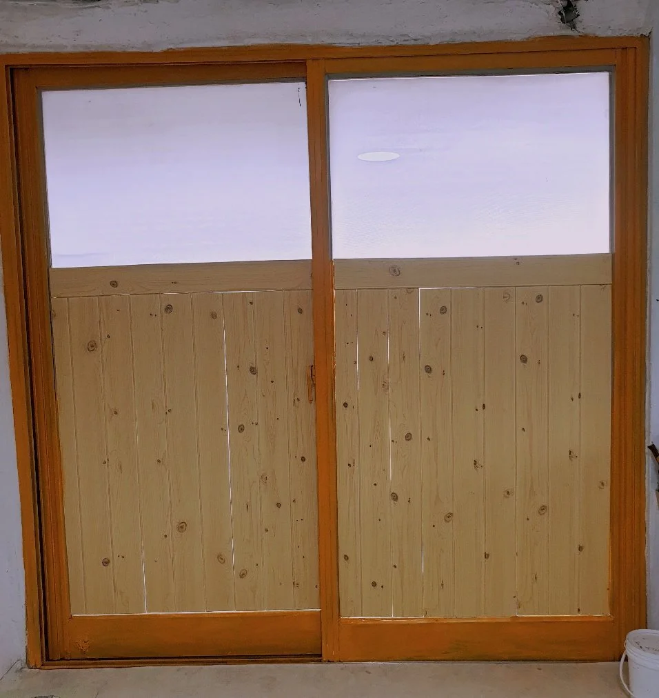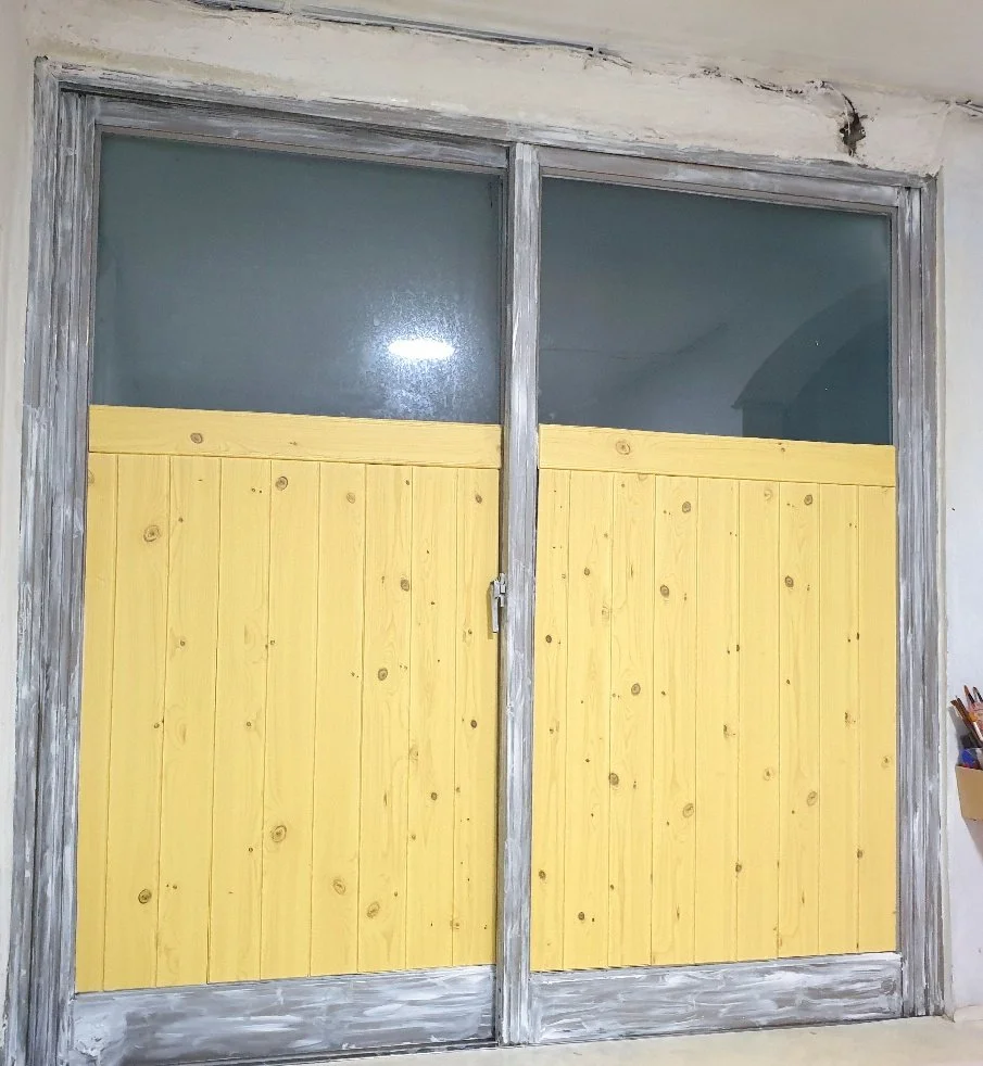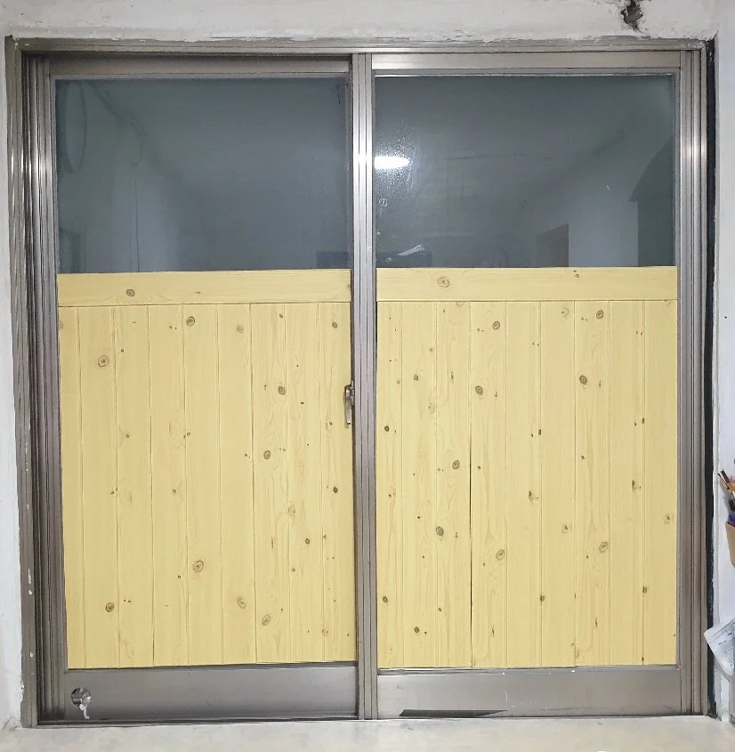 먼저 알미늄 새시에 젯소를 바르고 우드 느낌의 패널을 붙여 주었다.