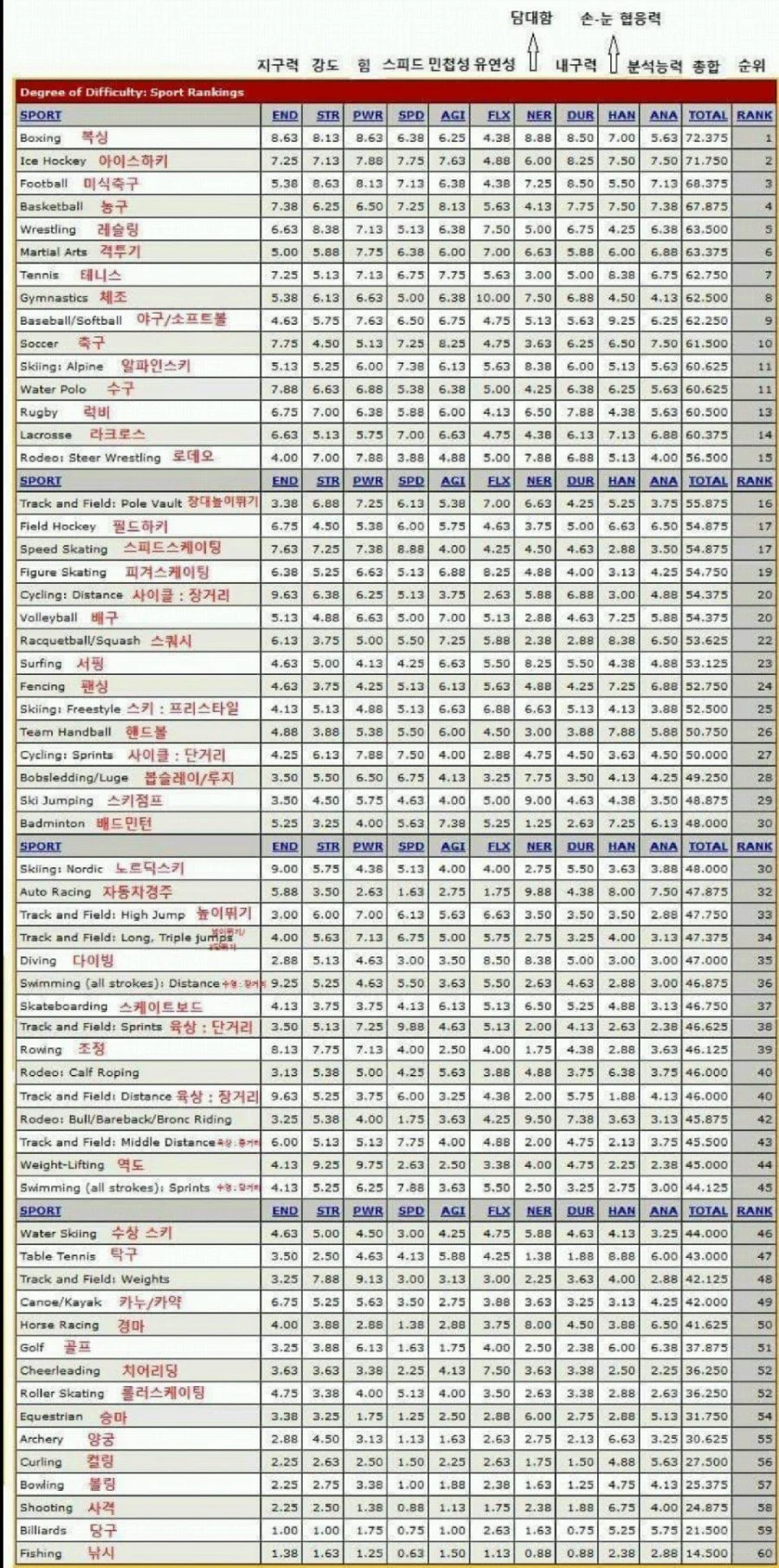 2010년. ESPN(Entertainment and Sports Programming Nerwork) 선정, 복싱은 세상에서 가장 힘들고 어려운 스포츠 1순위에 올랐다. 위 순위는 전문가들이 각 종목의 어려움의 정도를 수치화해서 매긴 것이며, 단순 체력적 어려움이 아닌 손과 눈의 협응, 담대함, 유연성 등 종합적인 어려움을 기준에 두고 판단한 것이다. 하지만 이 표를 본 많은 사람들이 축구보다 야구가 왜 위인지, 격투기보다 복싱이 왜 위인지 등등 표가 잘못됐다며 불성설을 주장했다. 물론 어느 정도 납득이 간다. 인간이 육체를 사용해 펼치는 스포츠는 심리적으로도 육체적으로도 상당히 정교하고 미세한 부분이기에 아무리 전문가가 종합적 기준을 두고 판단했다 하더라도 스포츠끼리 그 어려움의 정도를 모두가 납득할 수 있을 정도로 객관적으로 메길 수는 없다고 생각된다. 하지만 한편으로는 납득이 되는 게, 전문가가 무려 11개의 기준을 두고 소수점 둘째 자리까지 수치화를 시켜놨으니 마냥 틀렸다고 볼 수도 없기 때문이다. 많은 사람들이 의문을 가졌던 격투기와 복싱을 생각해보자. 단순히 겉으로만 보면 격투기가 손, 발, 무릎, 관절기를 쓰는 등 훨씬 힘들고 어려울 것 같은데 또 그렇지 않은 이유가 격투기는 5분 5라운드인데 비해 복싱은 3분 12라운드까지 뛰어야 하며, 계속 서 있어야 하는 복싱과 달리 격투기는 그라운드 상황에서 조금이나마 체력을 보충하는 방법도 있다. 또 싱은 격 수단이 단순히 주먹 하나로 귀결되기 때문에 기술적인 집중에 있어서 그 수준이 상당히 높으며 수 싸움의 난이도 또한 굉장히 높다고 판단할 수 있다. 물론 어디까지나 내 개인적인 견해이고, 격투기의 5분 5라운드도 정말 넘사벽이라고 생각한다. 여하튼 뭐가 더 높고 낮고를 떠나 위 표는 어디까지나 강함의 기준이 아닌 스포츠의 기준이며, 일반인의 기준이 아닌 선수의 기준이기에 복싱이 모든 스포츠 중에서 어려움을 기준으로 뒀을 때 상위에 속하는 것은 확실하다고 생각된다.