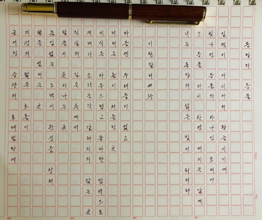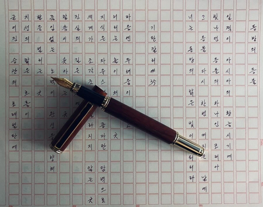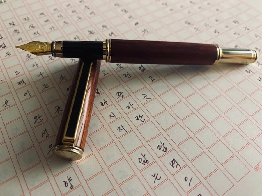 한글과 영어 모두 얼마 전 미국 대통령이 탐낸 우리 대통령의 펜으로 유명세를 얻은 국산 수제 만년필 브랜드 제나일에서 만든 만년필. 한글은 ef nib, 레오나르도 잉크, 영어 필기체는 f nib, 펠리칸 4001 잉크.