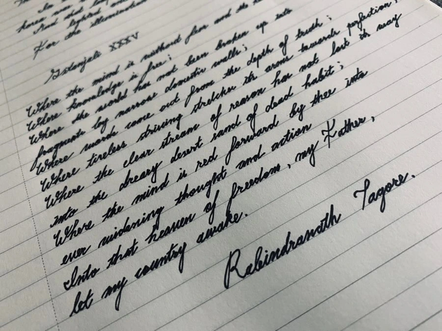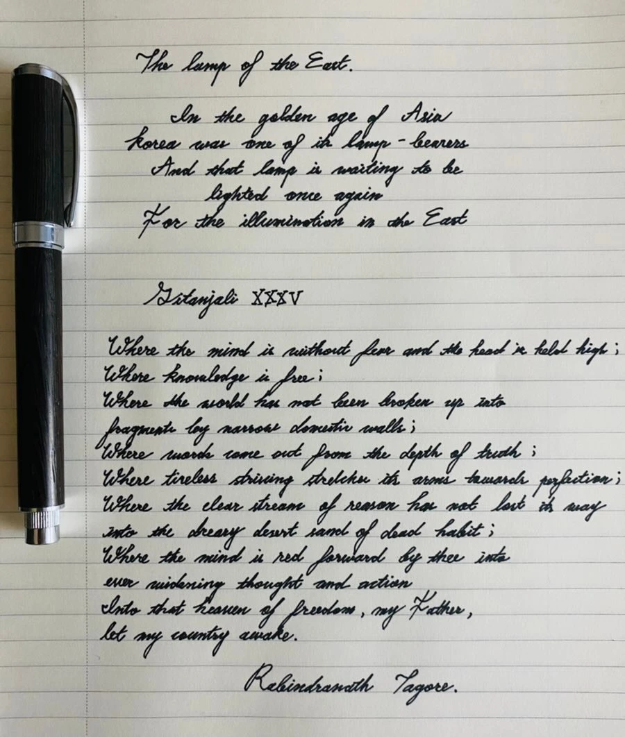 필사한 글은, 동양인 최초로 노벨 문학상을 받은 인도의 시성이자, 억압받는 자신의 조국을 위하여 헌신했던 인물이며, 간디에게 '마하트마'라는 호칭을 붙여준 인물이며, 우리에게는 '동방의 등불'이라는 시로 널리 알려진 타고르의 시 두 편.