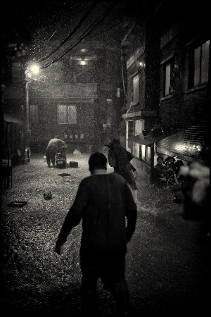 어느 계단에서 기우는 갑자기 걸음을 멈춰서 흘러 내려오는 빗물이 세차게 자신의 다리를 때리며 아래로 내려가는 것을 말없이 쳐다본다.