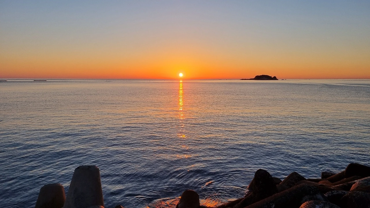 남편의 탄성과 얼굴에 부딪히는 시원한 바람에 눈을 떴더니 남편이 뒷트렁크를 열고 일출을 폰에 담고 있다. 눈을 겨우 뜨고 바라본 바다 저 너머로 둥실 태양이 떠오르고 있다.
