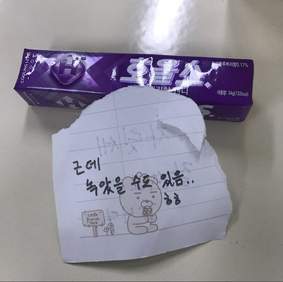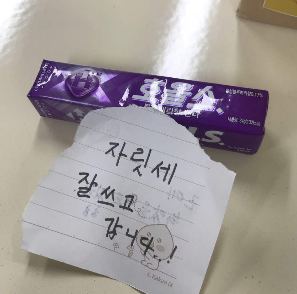 위 사진은 내가 남겨두고 온 자릿세이다. 수능날 자릿세라고 작은 간식을 주는 것은 내 로망이었다. 포스트잇을 가져오지 않아서 급하게 요점정리 노트의 귀퉁이를 찢어서 감사인사를 짧게 쓰고 남겨두고 왔다.