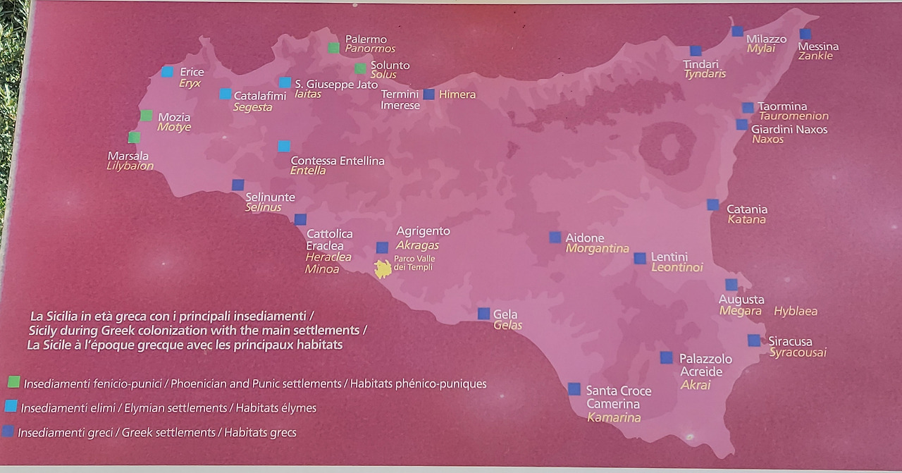 지도에서 푸른색 표시로 된 곳에 그리스 도시가 있었다. 아그리젠토는 남쪽 해안 노란색 표시가 된 곳이다.