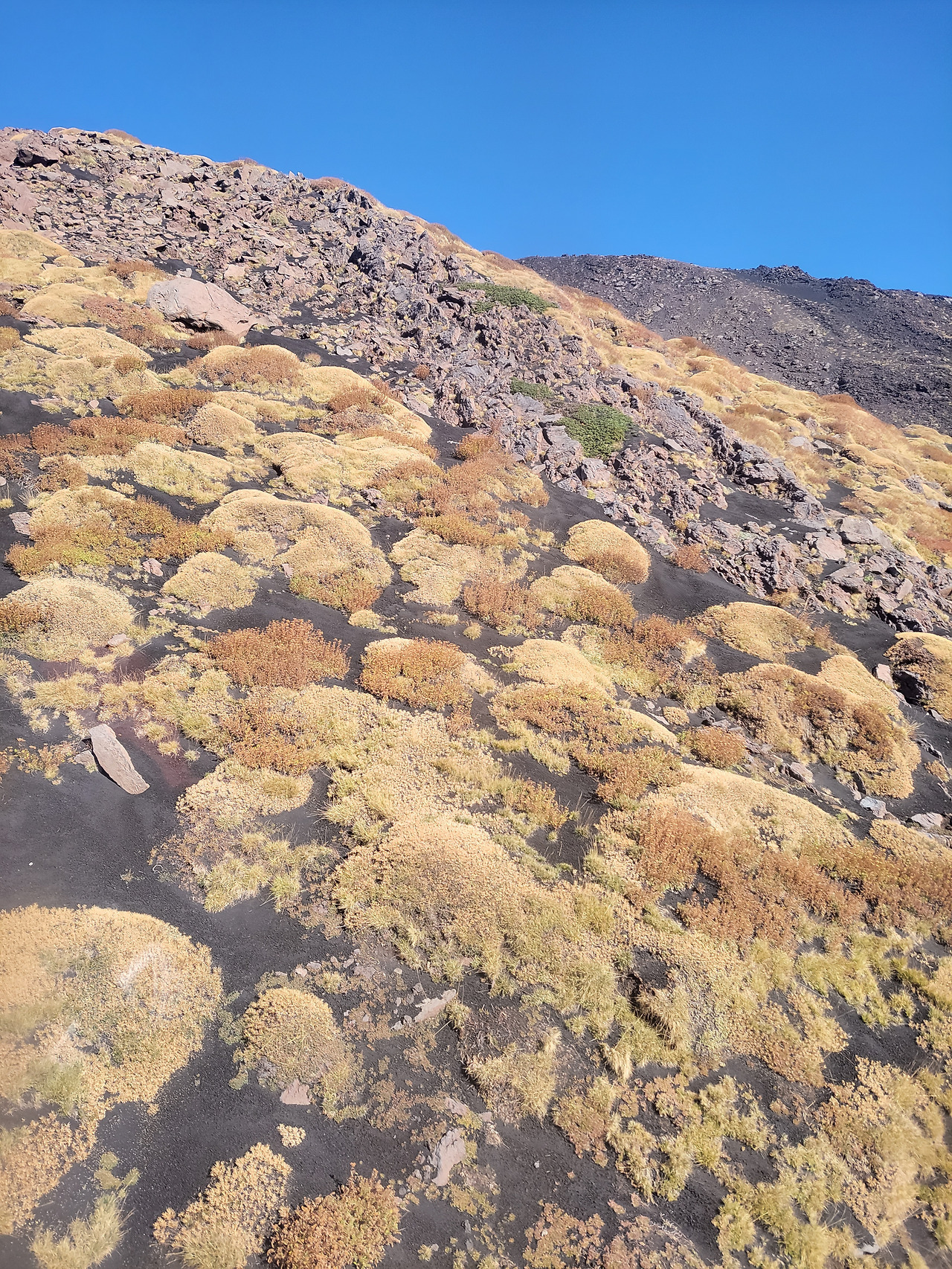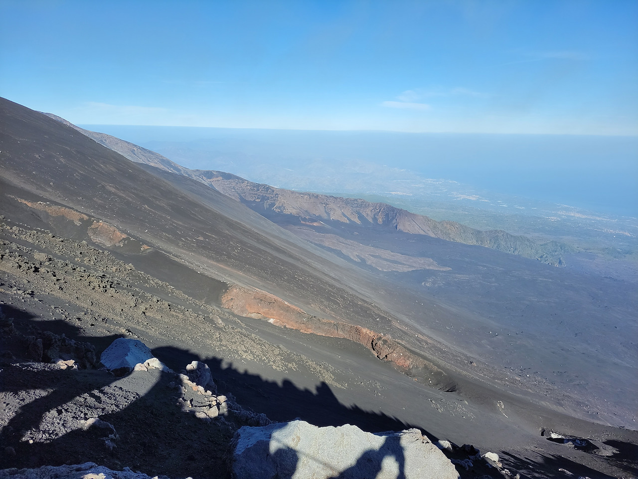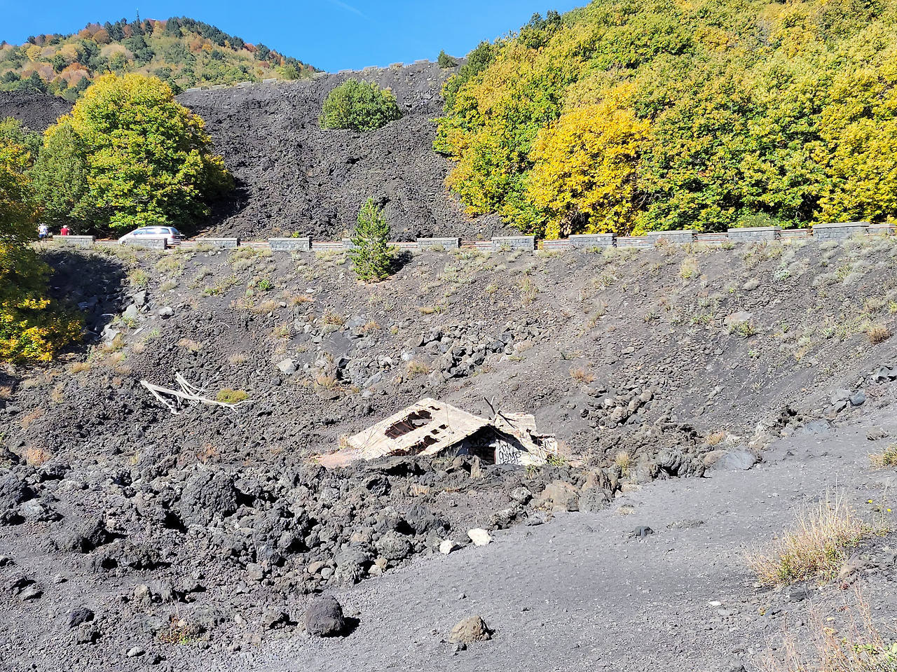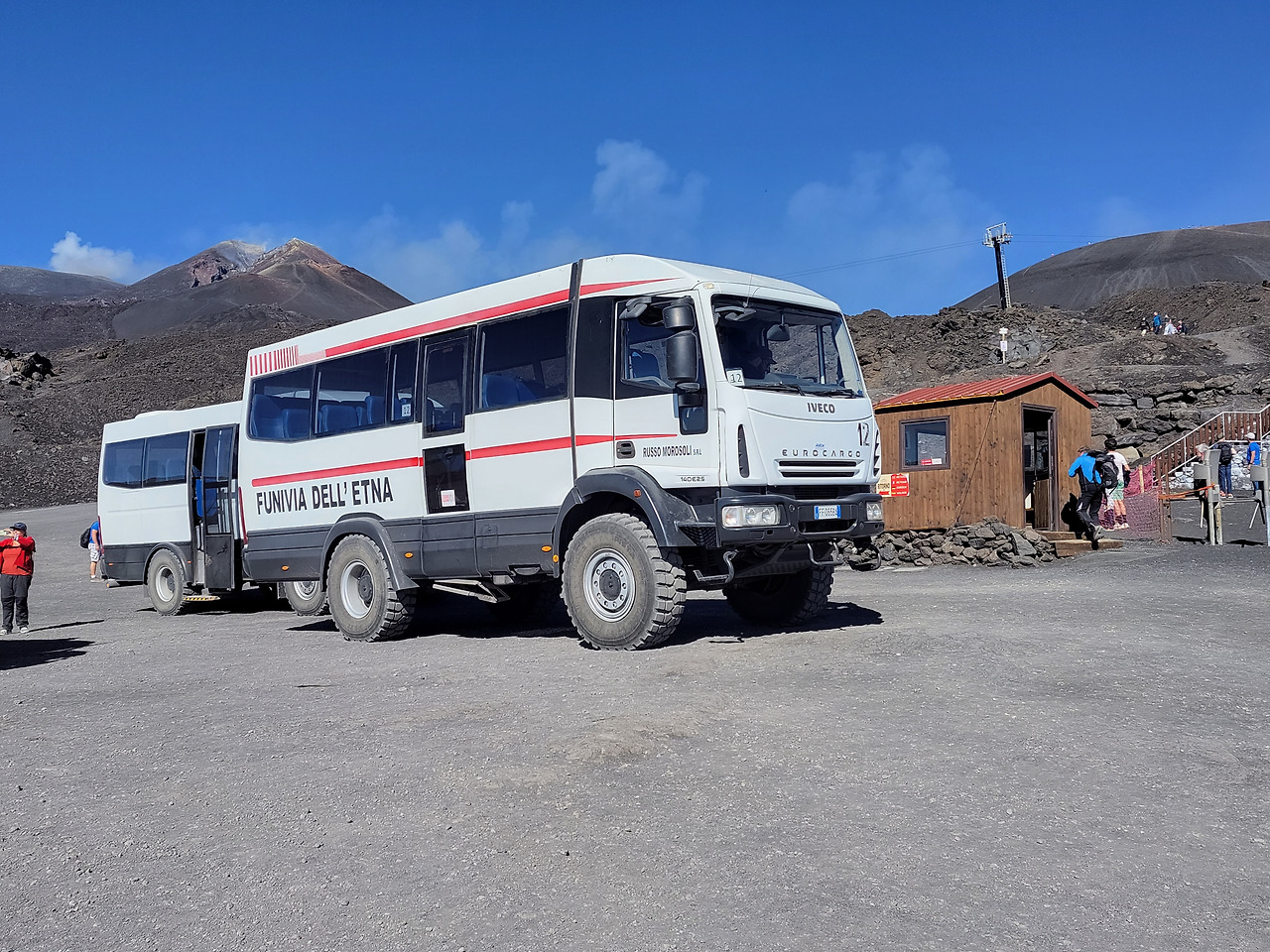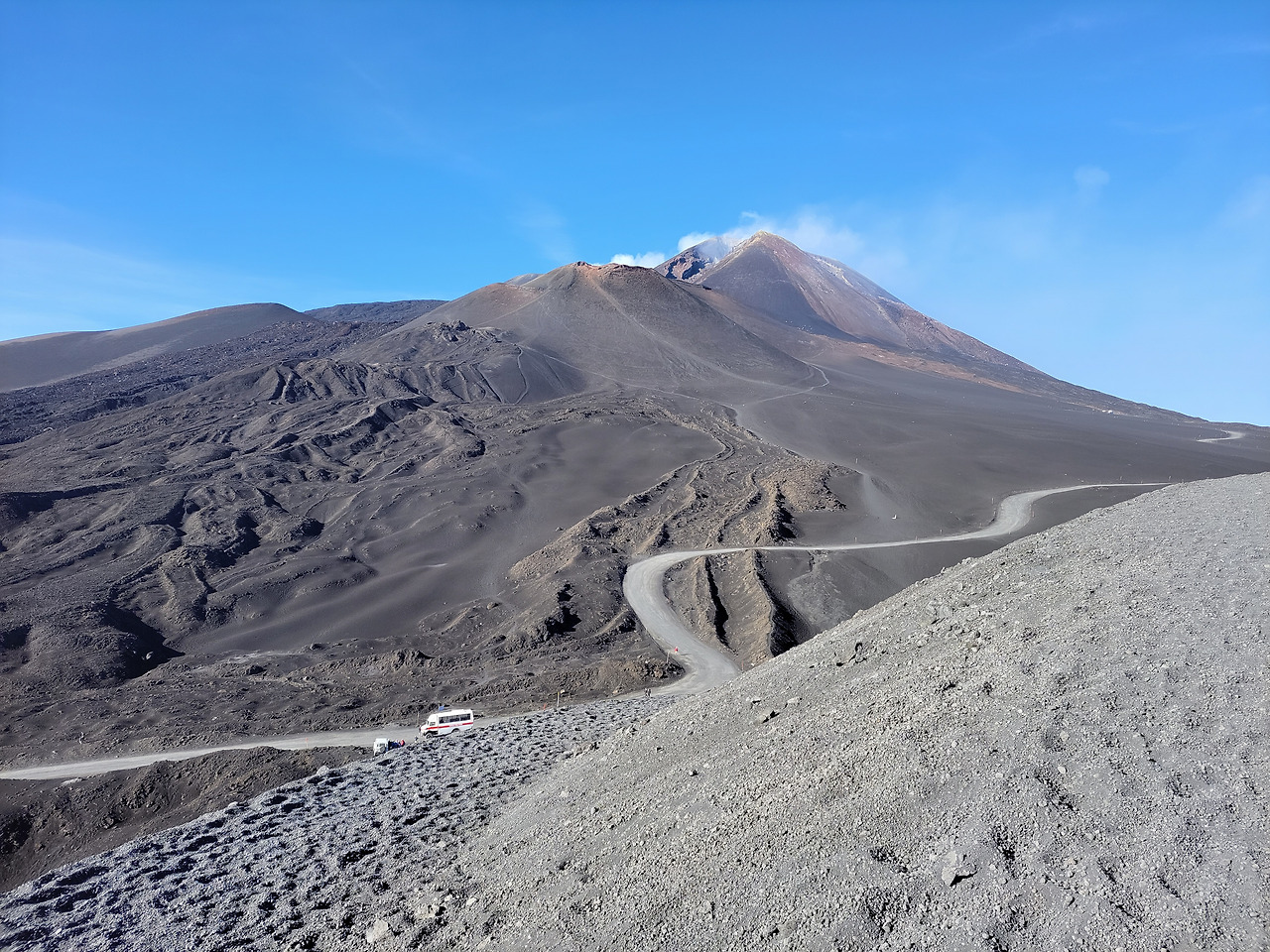 화산을 둘러싸고 형성된 이야깃거리는 풍부할지 몰라도, 눈으로 보는 화산 지대는 사실 아파트 재건축 공사장 비슷한 분위기의 황량한 흙더미에 불과할 뿐 볼거리는 별로 없다. 단체 버스는 에트나 산 등성이의 도로를 오르면서, 2018년 용암이 휩쓸면서 형성된 폐허 자리에 군데군데 들러 사진 찍을 기회를 주곤 했다. 승객들은 종점에 이르러 버스에서 내려 케이블카로 갈아탔다. 여기서 산 정상으로 가는 사륜구동 차량에 탑승했는데, 차는 얼마 안 가 멈췄다. 높이로는 해발 2750미터 지점이었는데, 사실 케이블카 하차 지점에서 얼마 떨어지지 않은 곳이었다.