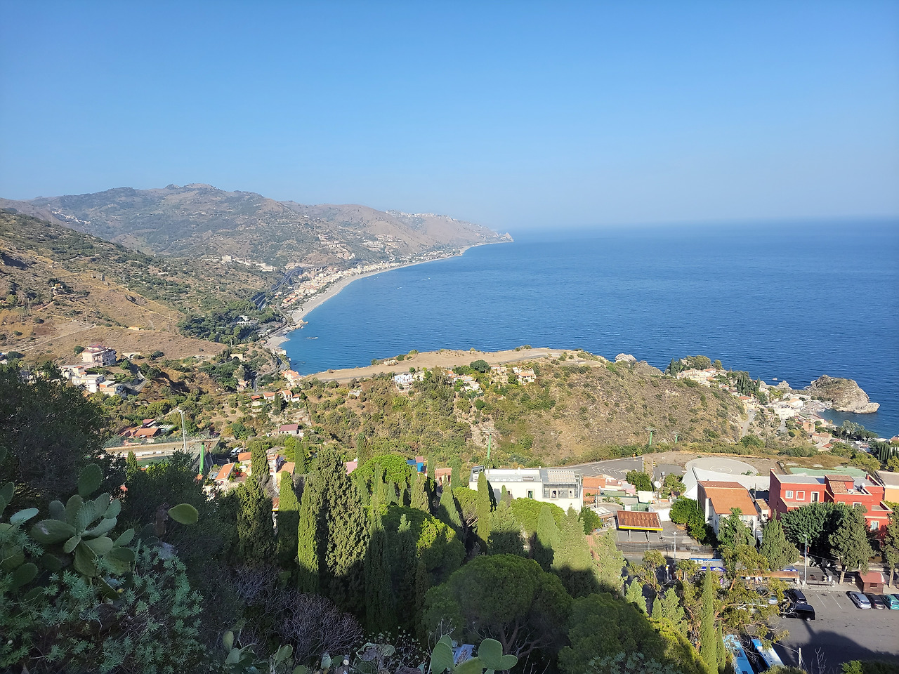 괴테, 니체 등 유럽의 유명 지식인 겸 한량들이 지상의 천국 어쩌고 하며 온갖 허튼소리를 다해놨지만, 이 시즌의 타오르미나는 그냥 코딱지 만한 마을에 관광객만 바글거리는 영락없는 휴양지다. 호텔이든 음식이든 물가는 믿을 수 없을 정도로 비싸지만, 어차피 뜨내기손님을 대상으로 영업하는지라 업소들도 그렇게 친절한 것 같지 않다. 해변을 끼고 언덕에 들어선 마을이라 전망은 당연히 아름답다. 시가지가 모두 언덕배기에 자리 잡고 있어 찻길은 비탈을 뱀처럼 휘감고 올라가 차 안에서 보기만 해도 정신이 아찔하다. 그런데도 저 길을 한치 오차도 없이 휙휙 회전하는 기사 운전 솜씨가 경탄스러울 뿐이다.