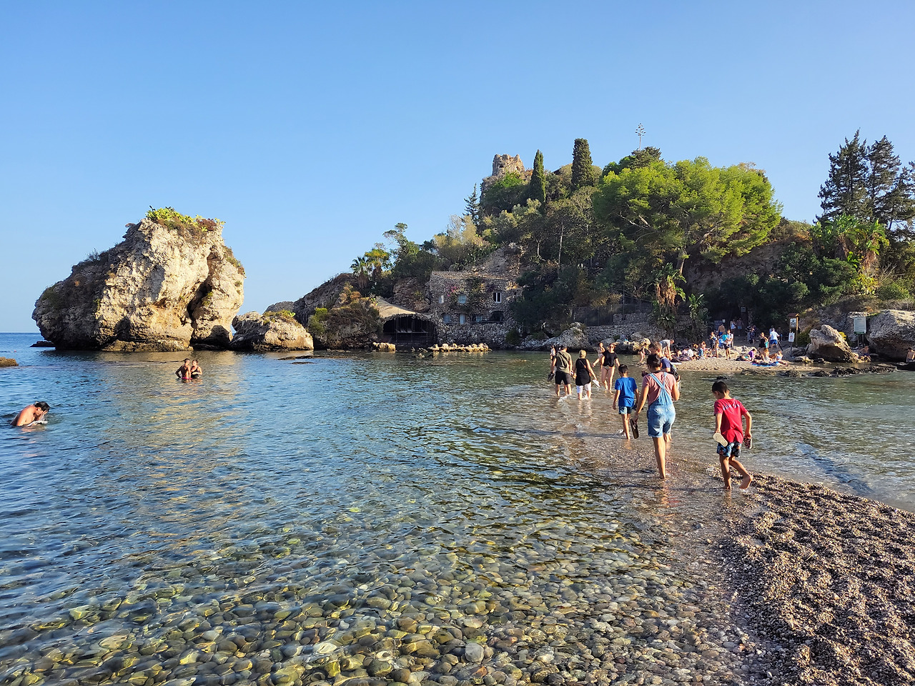 마지막으로 이곳의 명물 이솔라 벨라(이탈리아어로 아름다운 섬이란 뜻이다)를 보기 위해 케이블카를 타고 해변으로 내려갔다. 영화 <그랑블루>도 이 해변을 배경으로 촬영했기에, 상당한 기대를 품고 있었다. 근데 막상 마주하고 보니 딱 부산 근교 동해 쪽의 이름 없는 해수욕장 보다도 더 작은 반원형의 자갈 해변에 불과했다. 좁은 해변은 그나마 휴양객으로 거의 틈새조차 없이 가득 차 있었다. 두 개의 작은 해변 사이로 아주 작은 섬이 하나 있는데 이게 이솔라 벨라란다. 섬에는 별장과 정원이 조성되어 있는데, 밀물 탓인지 모르나 종아리까지 올라오는 바닷물을 헤치고 자갈밭을 걸어서 건너야 섬에 도달할 수 있다. 그냥 포기하고 뒤돌아서 나오는데, 문득 부산 근교의 멋진 해변과 섬, 비탈길 생각이 났다. 지중해의 바닷물은 바닥이 다 들여다 보일 정도로 맑고 투명했다. 관광객으로 특식대는 휴가철이라도 타오르미나의 바다는 여전히 아름다웠다. 그렇지만 영화와 같은 신비로운 장면을 기대했다간 실망하기 십상이다.