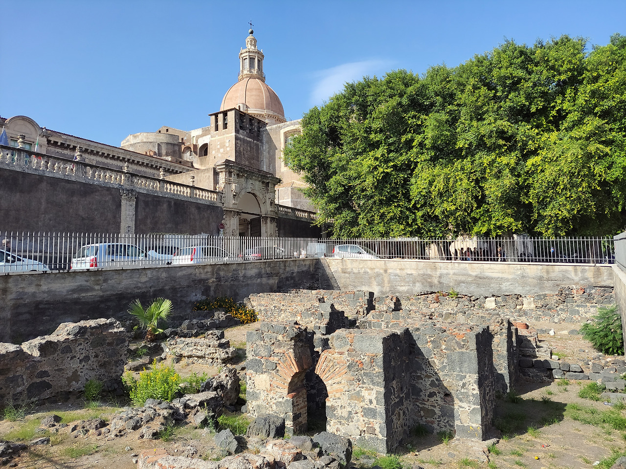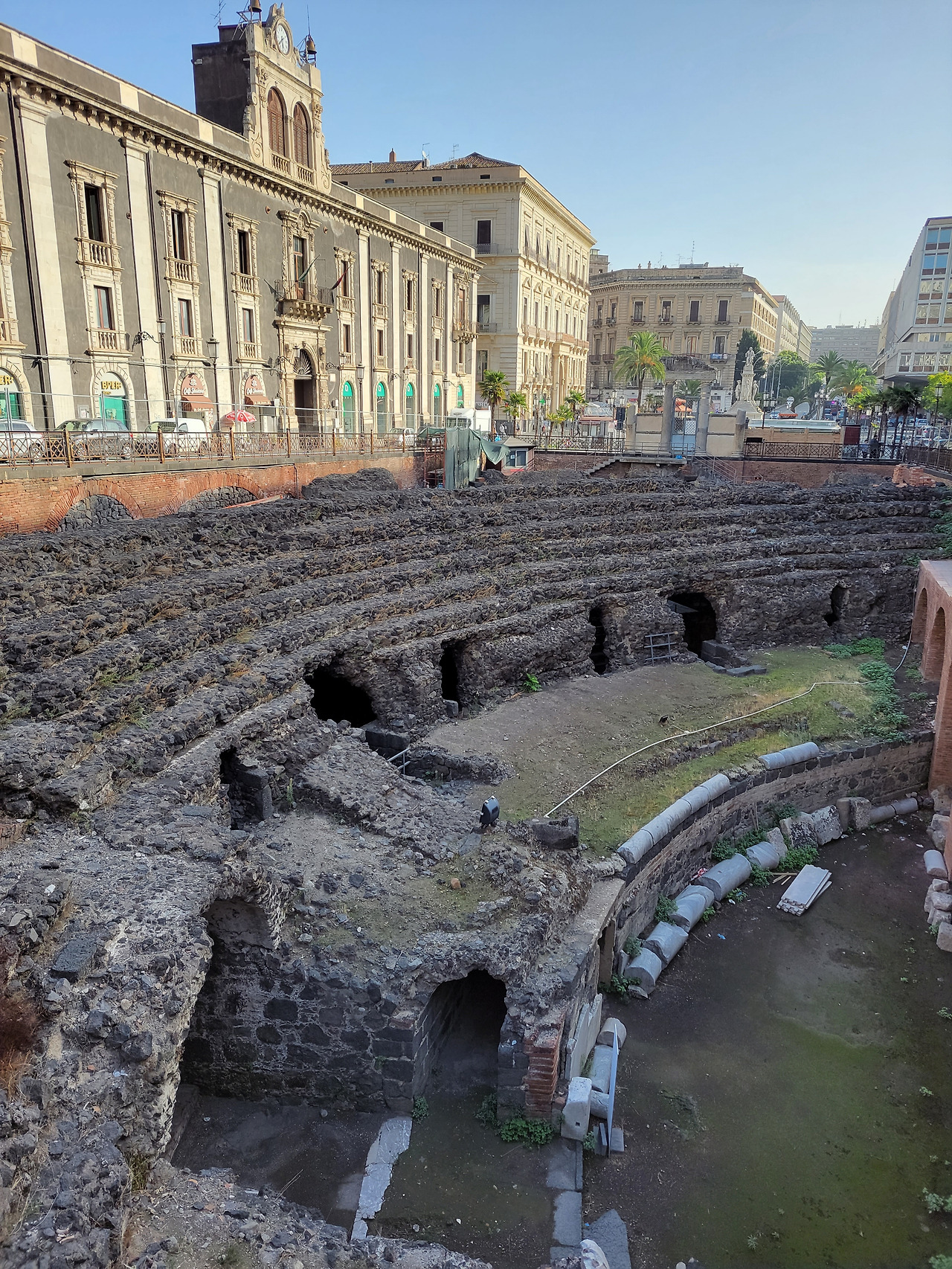 우선 숙소에서 그다지 멀지 않은 스테시로코 광장 부근에 로마 원형경기장이 있다고 해서 걸음을 옮겼다. 그런데 분명 지도에 표시된 지점에 도착했는데, 경기장을 연상시키는 건축은 전혀 보이지 않았다. 자세히 보니 울타리가 둘러쳐진 공터 아래로 무슨 폐허 비슷한 곳이 눈에 띈다. 한때 원형경기장이 있던 자리에서 거대한 건축물은 거의 다 사라지고 일부 기둥과 토대만 반지하에 남아 있었던 것이다. 원형경기장처럼 존재감이 큰 유적이 가이드북에 표시되지 않은 이유를 알 것 같았다. 석재는 거의 검은색이었는데, 아마 세월 탓만은 아니라 석재 자체의 색깔이 그랬던 것 같다. 카타니아 인근에 에트나 화산지대가 있으니 검은 화산석이 가장 조달하기 쉬운 자재였던 게 당연하다.