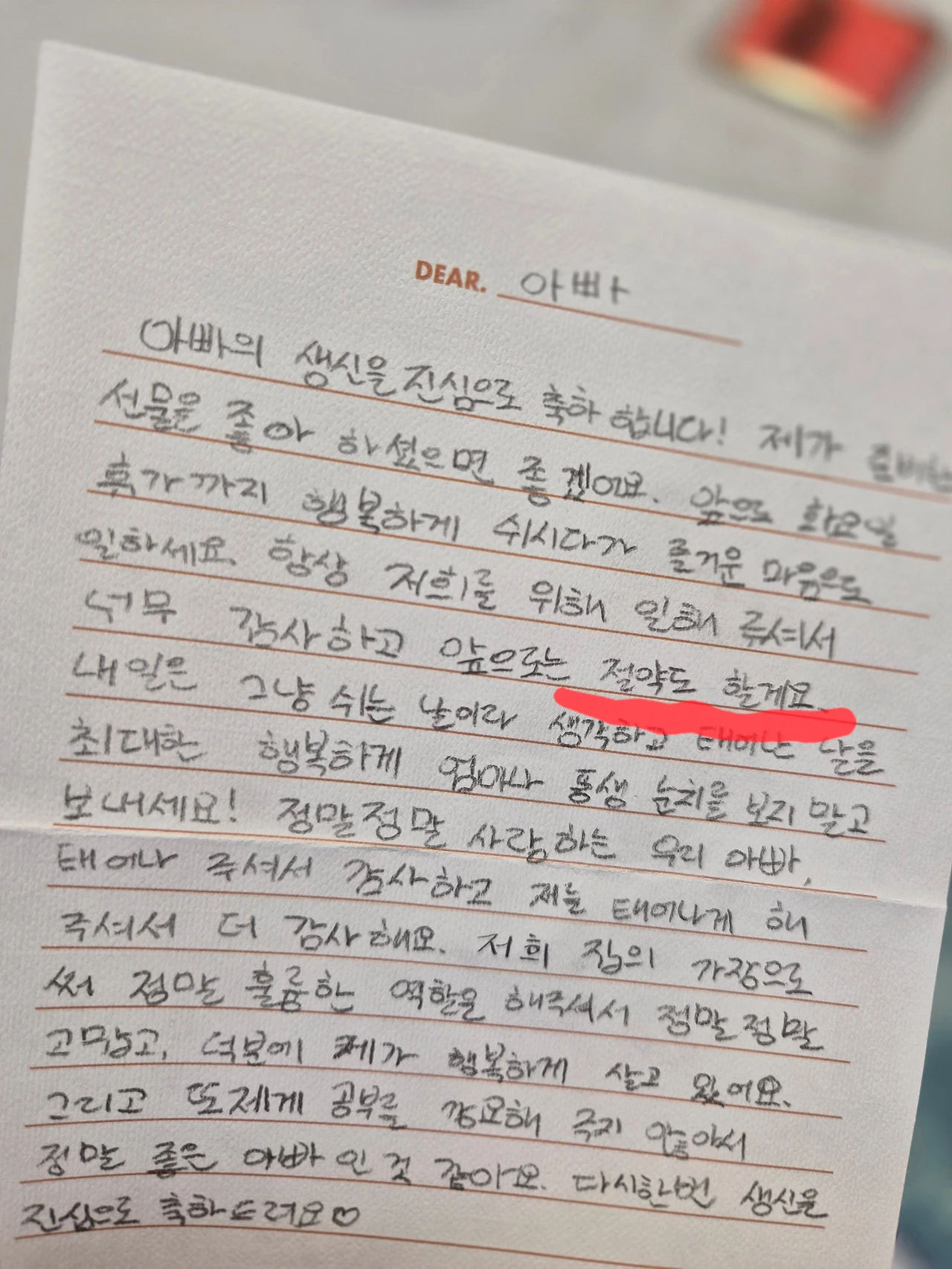 다시 본론으로 돌아와, 딸아이 편지 내용의 단어 하나하나가 어느 문학 작품보다 감동이었으나 그중에서도 딸의 '절약도 할게요'라는 표현을 마주하니, 그동안 나와 와이프가 딸아이에게 좋은 경제관념을 물려준 것 같아 마음이 뿌듯했다.